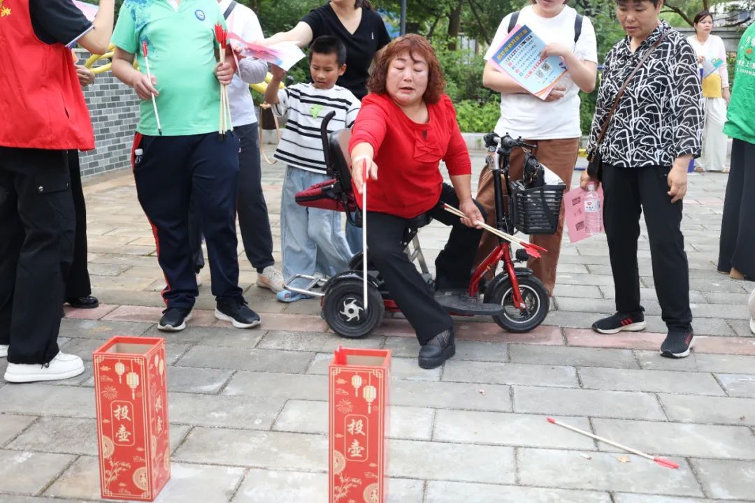 活动现场热闹非凡,在夹乒乓球比赛中,残疾人朋友争分夺秒地将乒乓球用筷子从一个容器夹到另一个容器,比赛过程紧张激烈、充满欢声笑语。而投壶、扔沙包环节,参与者全神贯注,每一次精准投掷都赢得阵阵掌声,大家在游戏中尽情享受欢乐时光。随后,主办方为参与活动的残疾人朋友颁发了日用奖品。