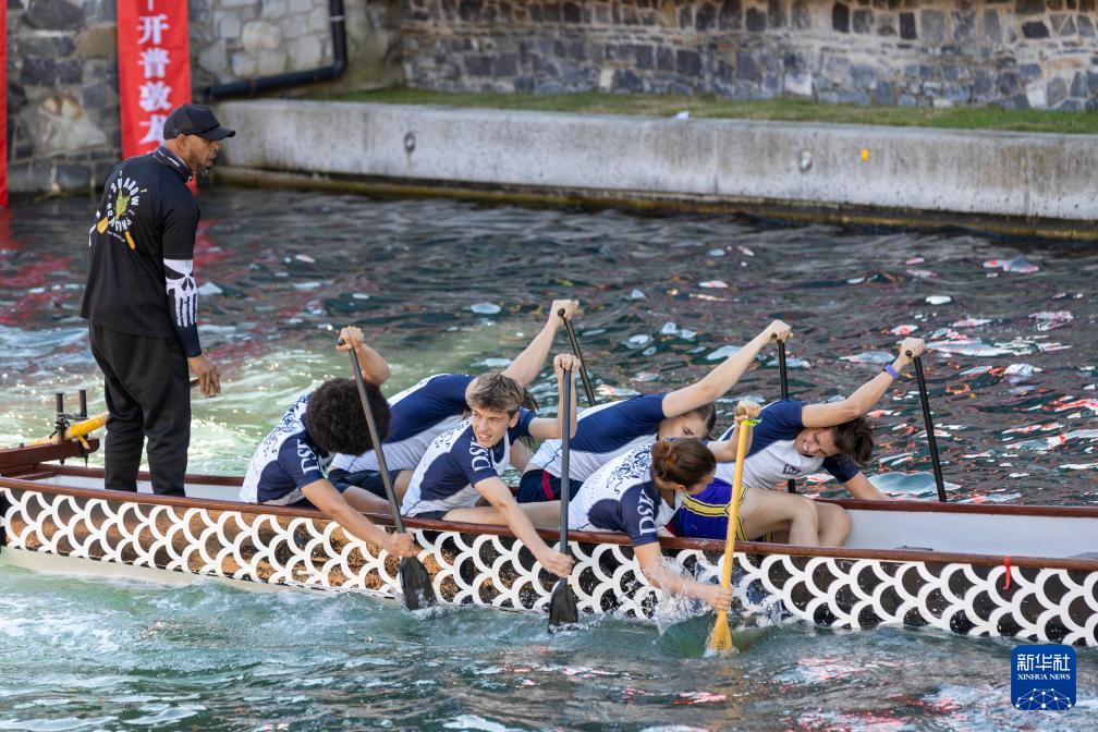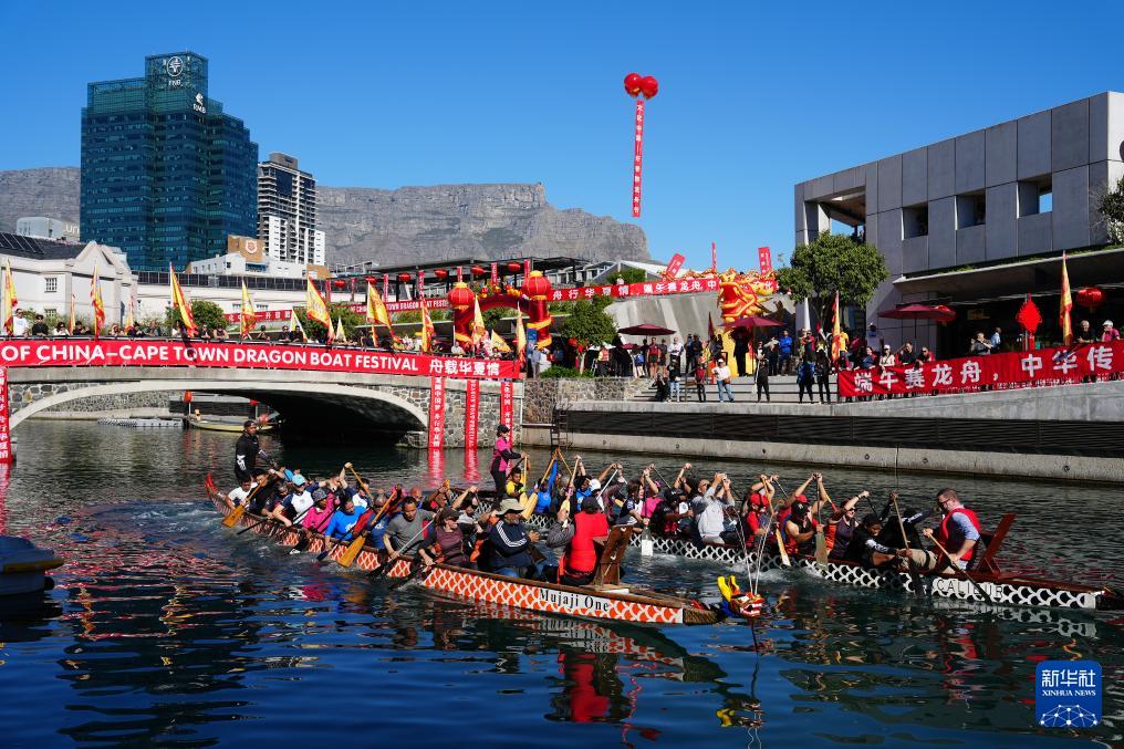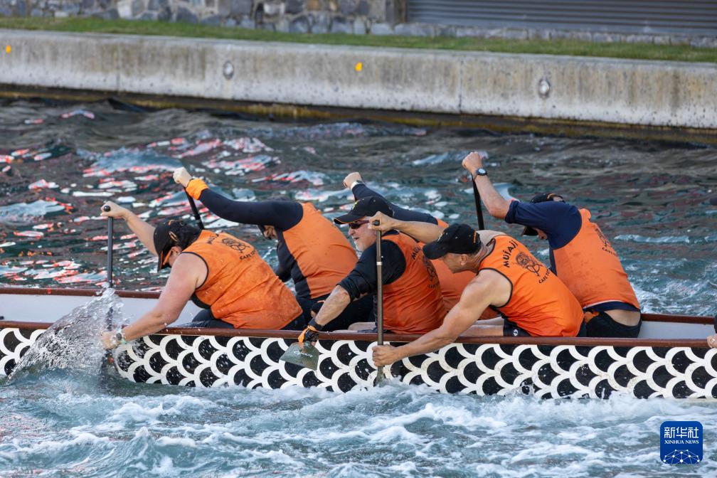 5月24日,人们在南非开普敦参加龙舟比赛。 为迎接中国传统节日端午节,海外多地近日举行龙舟比赛等活动,让民众体验到多元文化交融的魅力。 新华社记者 王雷 摄