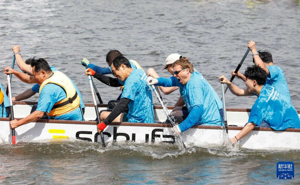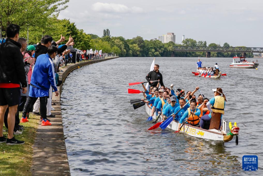 5月24日,在德国法兰克福,龙舟队队员与岸上观众互动。 为迎接中国传统节日端午节,海外多地近日举行龙舟比赛等活动,让民众体验到多元文化交融的魅力。 新华社记者 张帆 摄