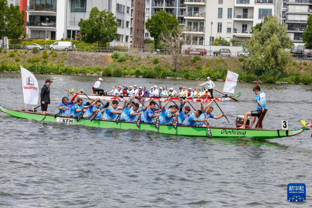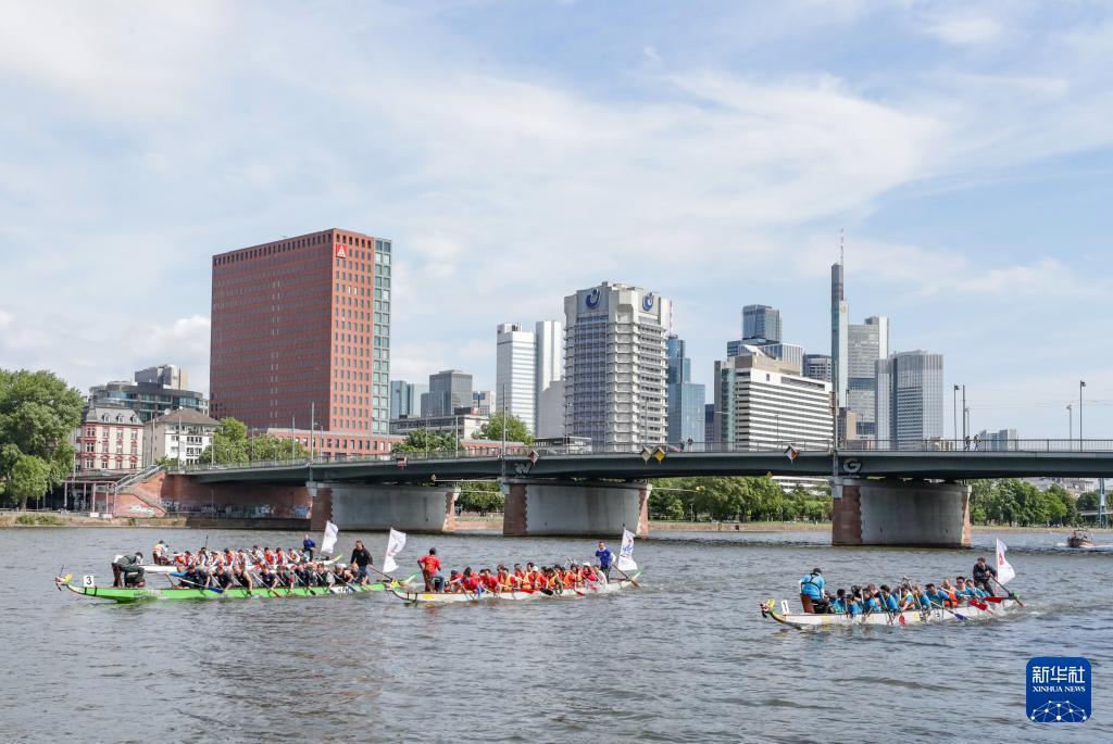 5月24日,人们在德国法兰克福美因河上参加龙舟比赛。 为迎接中国传统节日端午节,海外多地近日举行龙舟比赛等活动,让民众体验到多元文化交融的魅力。 新华社记者 张帆 摄