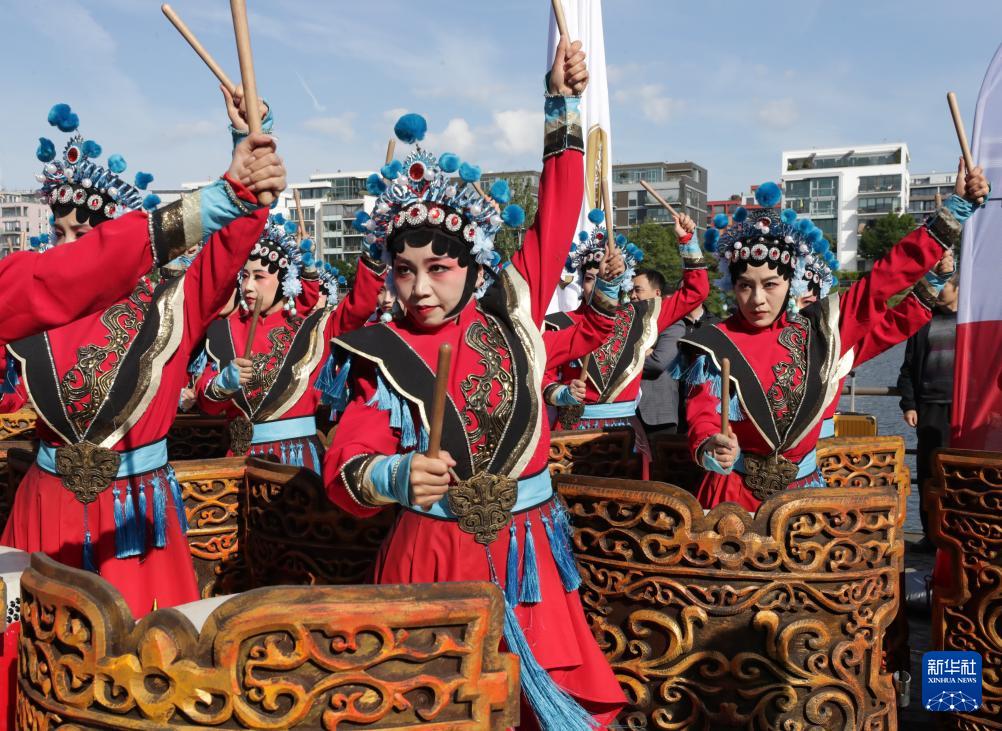 5月24日,中国陕西神木杨家将战鼓在德国法兰克福国际龙舟友谊赛期间表演。 为迎接中国传统节日端午节,海外多地近日举行龙舟比赛等活动,让民众体验到多元文化交融的魅力。 新华社记者 张帆 摄