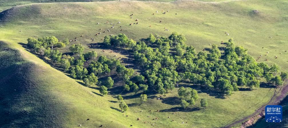 6月5日,牛群在内蒙古大青山国家级自然保护区吃草(无人机照片)。 盛夏时节,位于内蒙古自治区呼和浩特市北部的内蒙古大青山国家级自然保护区绿意盎然,呈现出一派生机勃勃的美丽景象。 新华社记者 马金瑞 摄