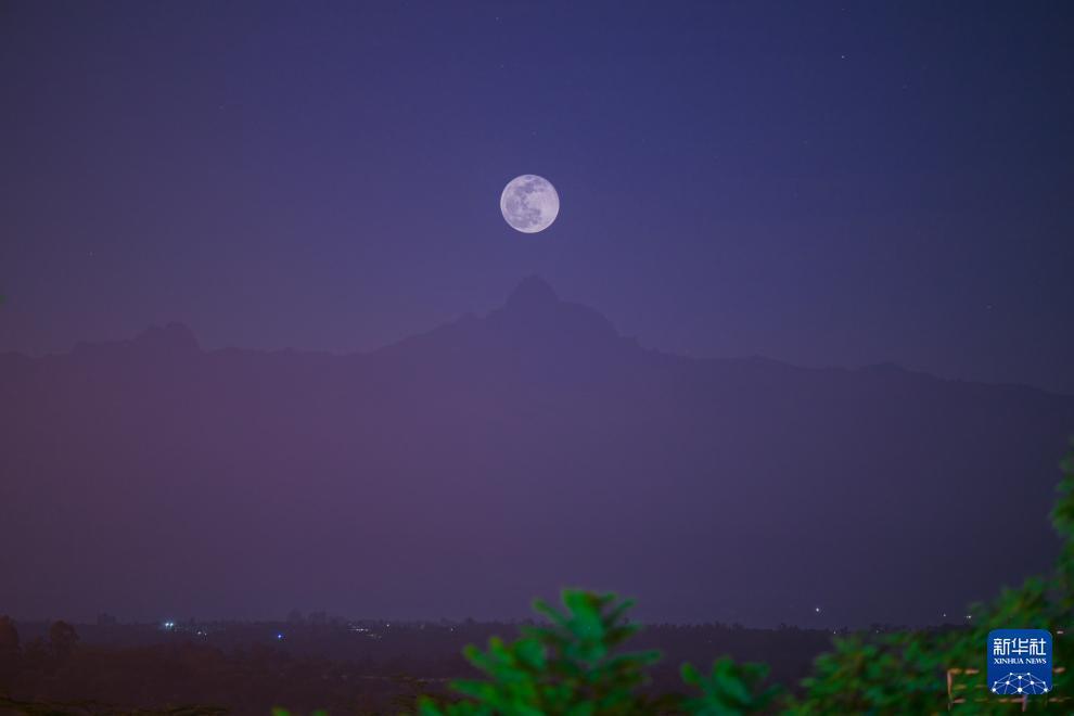 这是10月7日在肯尼亚纳纽基拍摄的圆月和肯尼亚山主峰巴蒂安峰(二次曝光)。