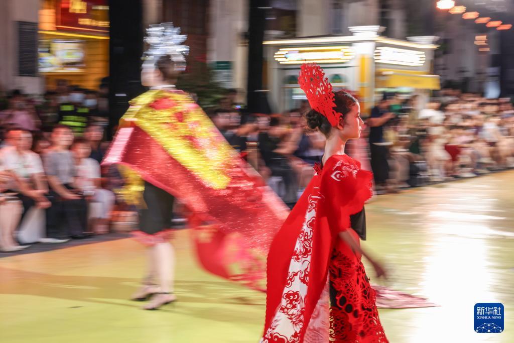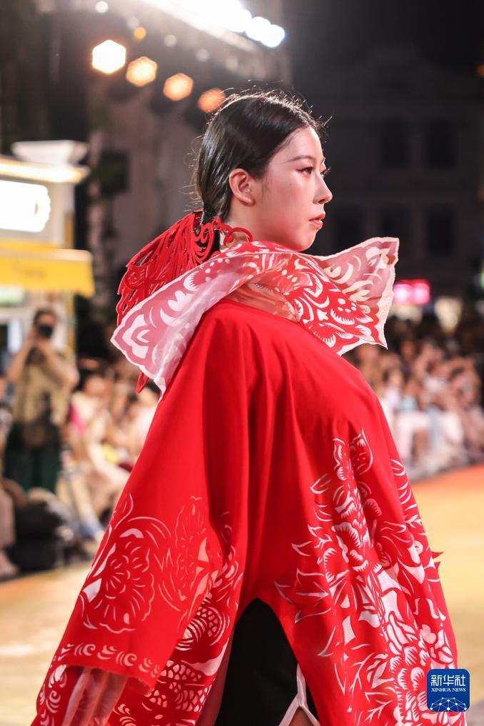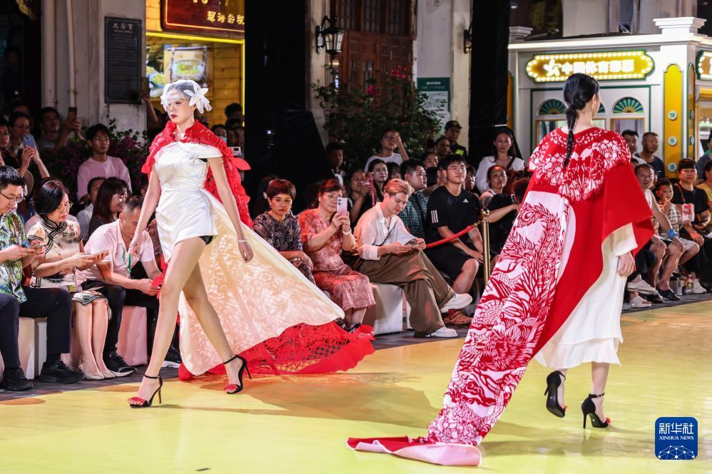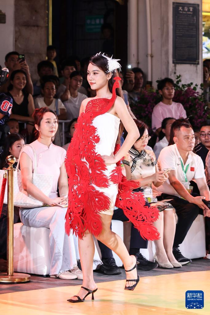 10月7日,身穿剪纸主题时装的模特在海口骑楼老街走秀。 10月7日晚,作为2025海口艺术周系列活动之一,锦色·2025非遗潮秀在海口骑楼老街启幕。活动以"非遗再创"为核心,将剪纸艺术元素融入时装走秀。 新华社记者 张丽芸 摄