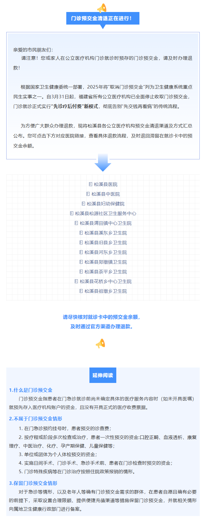 门诊预交金清退正在进行 松溪县总医院提醒您及时办理退款
