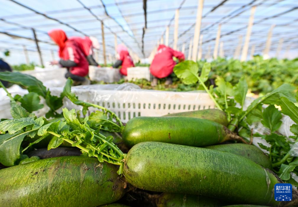 11月20日,在天津市西青区辛口镇种植沙窝萝卜的大棚内,农民在采摘萝卜。 时下,天津市西青区辛口镇的沙窝萝卜进入采收期。当地农民有序开展采收、包装、发货等工作。今年,全镇种植沙窝萝卜约8100亩,预计总产量可达7000万斤,带动村民致富增收。 新华社记者 赵子硕 摄