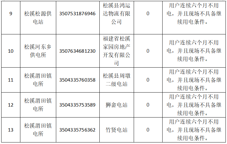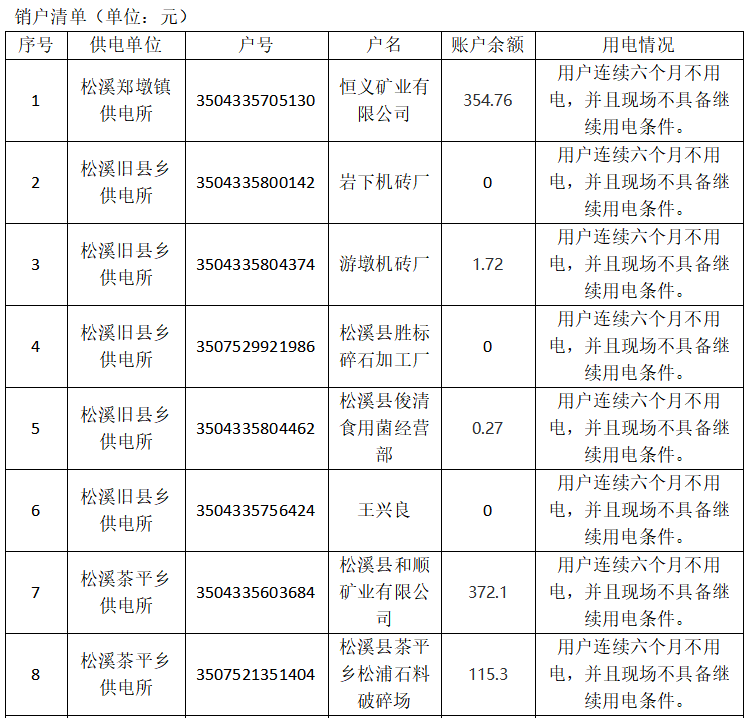 尊敬的电力用户: 为提高电网资源利用率,规范供用电秩序,根据《供电营业规则》第三十五条“用户连续六个月不用电,且经现场确认不具备继续用电条件或存在安全用电隐患的,供电企业就当向用户进行告知,或公告一个月后予以销户。用户需再用电时,按照新装用电办理。”经国网松溪县供电公司核实,松溪县以下用电户号现场已无用电设备或者超六个月无用电行为,部分用户账户有余额,现拟对以下用户办理销户及电缆预收款处理。 用户清单如下表。自公告之日起30日内,凡对上述清单中有异议者,请及时向国网松溪县供电公司书面反映;逾期未反映视为无异议,我公司将按照销户办理,并对电费预收款进行账务处理。 若有疑问,您可随时致电国网松溪县供电公司电话0599-7862529咨询,感谢您对我们工作的支持和配合。 国网福建省电力有限公司 松溪县供电公司 2025年12月1日