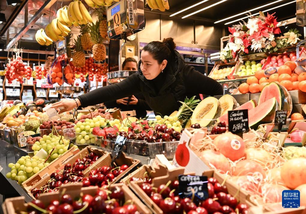 12月2日,摊贩在西班牙巴塞罗那市中心的博凯里亚市场售卖水果。 欧盟统计局2日公布的初步统计数据显示,欧元区11月通胀率按年率计算为2.2%,高于10月的2.1%,继续保持在欧洲央行的中期目标水平之上。 新华社记者 程敏 摄