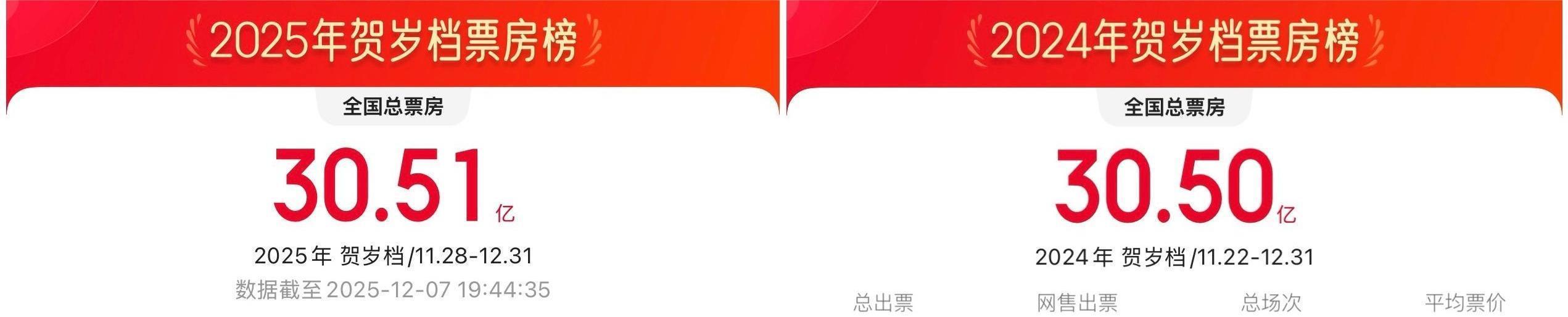 据网络平台数据,截至12月7日19时44分,2025贺岁档(11月28日—12月31日)票房突破30.51亿,超2024年贺岁档票房成绩。