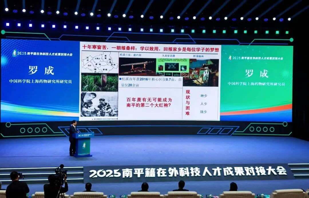 近日,南平市召开南平籍在外科技人才成果对接大会,众多南平籍科技英才齐聚一堂共叙乡情、共话发展。其中,18名松溪籍科技人才受邀参会,中科院上海研究所研究员罗成作为代表以“我国农业和药学新质生产力创制的新途径探索:松溪百年蔗为代表的地域特色农业资源药材化和产业化的实践”作专题分享推介。