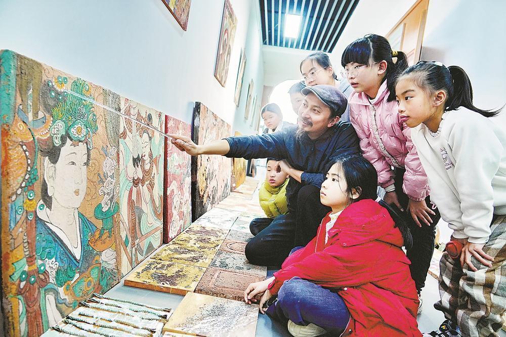 20日,参加武夷山市文化馆岩彩画公益课程的孩子们正在听老师讲解岩彩画作。