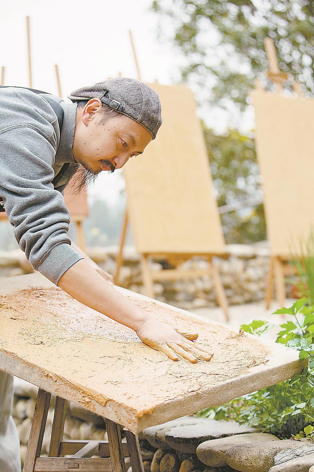 22日,武夷岩彩画师胡磊正在制作岩彩画板。