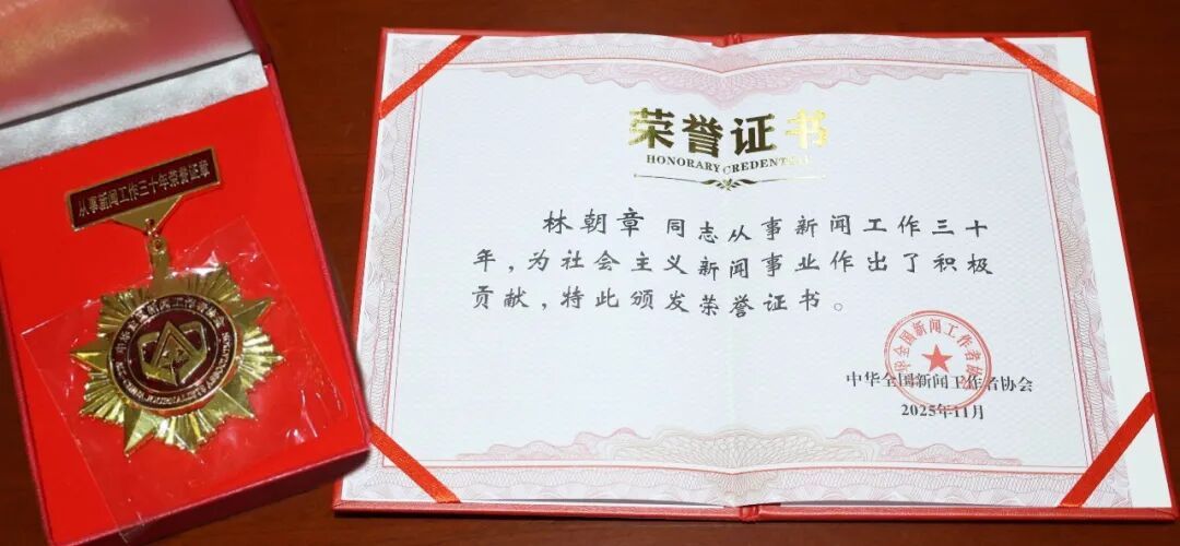 一路新闻情,一颗赤诚心。12月22日,县融媒体中心举行荣誉颁发仪式,为林朝章同志颁发“从事新闻工作三十年”荣誉证书与证章,以表彰他三十余年坚守新闻一线的辛勤付出。