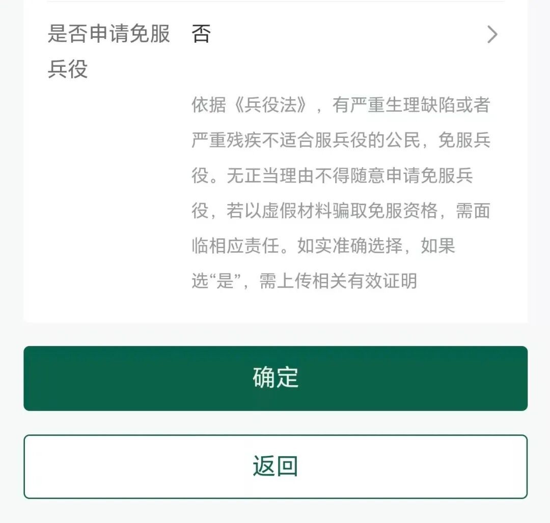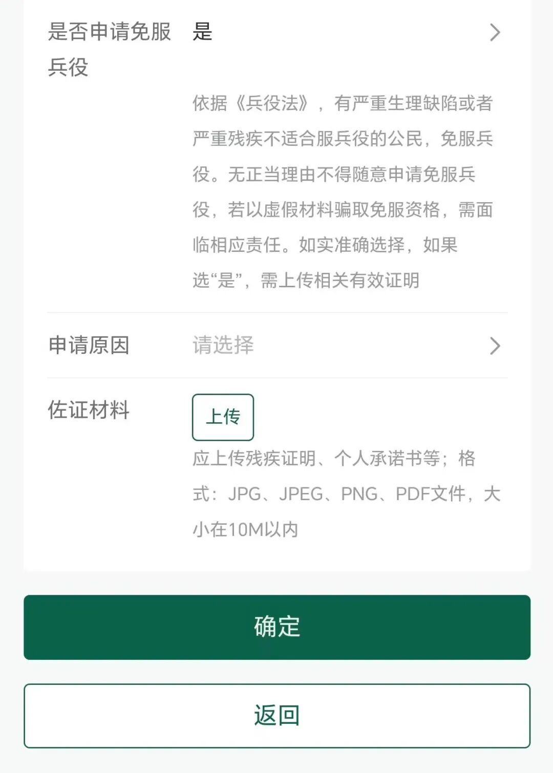 第十步 最后就是2026年新增的一项内容——“是否申请免服兵役”,如果身体健康的填“否”,就是符合服兵役条件,当然兵役机关不会强制你去报名入伍。如果个人有服兵役意愿,需要在“义务兵征集”菜单里继续申请才能报名参军