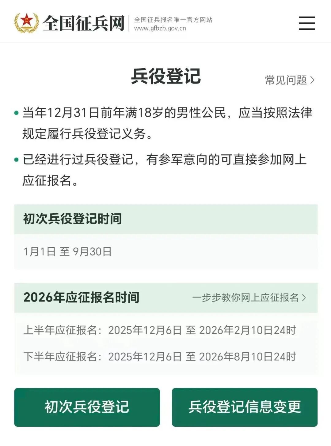 根据《中华人民共和国兵役法》、《征兵工作条例》和《兵役登记工作规定》相关规定,现将松溪县兵役登记有关事项公告如下: 郑重提醒 依法服兵役和进行兵役登记,是每个适龄公民的光荣义务和神圣责任。兵役登记是一项强制性制度,无论参军与否,适龄男性公民都应进行兵役登记。不进行、逃避或拒绝兵役登记的公民,将追究法律责任,影响升学、就业、考公、出国等! 登记对象 (一)2026年12月31日前年满18周岁(2008年1月1日-2008年12月31日出生)男性公民,均应参加兵役登记。 (二)2026年12月31日前,年满17周岁未满18周岁的男性公民,本人自愿应征的,或者当年上大学需领取《兵役登记证》的,也可参加兵役登记。 (三)未超过24周岁(截止2026年12月31日前)男性公民没有参加兵役登记的,均应进行补登。 (四)进行兵役登记时可同时参加2026年义务兵应征报名。上半年应征报名时间为2025年12月6日至2026年2月10日24时;下半年应征报名时间为2025年12月6日至2026年8月10日24时。如当年无参军入伍意向,兵役登记时可选择“只进行兵役登记,申请2026年度缓征”。 (五)往年已参加兵役登记的,可登录“全国征兵网”对个人登记信息进行核验并参加今年应征报名。 登记时间 2026年1月1日起,至2026年10月31日 法律责任 1.根据《中华人民共和国兵役法》之规定,男性适龄公民拒绝、逃避兵役登记的,应征公民拒绝、逃避征集服现役的,预备役人员拒绝、逃避参加军事训练、担负战备勤务、执行非战争军事行动任务和征召的,由县级人民政府责令其限期改正,逾期不改正的,由县级人民政府强制其履行兵役义务,并处以罚款;其中,应征公民拒绝、逃避征集服现役的,不得录用为公务员或者参照《中华人民共和国公务员法》管理的工作人员,不得招录、聘用为国有企业和事业单位工作人员,两年内不准出境或者升学复学,纳入履行国防义务严重失信主体名单实施联合惩戒。 2.机关、团体、企业事业组织拒绝完成《中华人民共和国兵役法》规定的兵役工作任务的,阻挠公民履行兵役义务的,或者有其他妨害兵役工作行为的,由县级以上地方人民政府责令改正,并可以处以罚款;对单位负有责任的领导人员、直接负责的主管人员和其他直接责任人员,依法予以处罚。 3.对未按照本规定要求进行兵役登记工作的相关单位或者个人,依照《中华人民共和国兵役法》、《中华人民共和国预备役人员法》、《征兵工作条例》等法律法规的规定处理,视情况纳入单位或者个人信用记录,由县级以上地方人民政府兵役机关和有关部门按照职责分工具体执行。 咨询电话 如有疑问,可拨打松溪县征兵办及各乡镇(街道)办公室咨询电话。 松溪县征兵办 0599-6915200 松源街道 0599-2321141 郑墩镇 0599-2266805 渭田镇 0599-2293001 河东乡 0599-6083206 旧县乡 0599-2233458 溪东乡 0599-2203001 茶平乡 0599-2258001 花桥乡 0599-2273001 祖墩乡 0599-2283001 兵役登记方法步骤 第一步 在浏览器中搜索“全国征兵网”或者输入网址https://www.gfbzb.gov.cn/点击“兵役登记(男兵)”