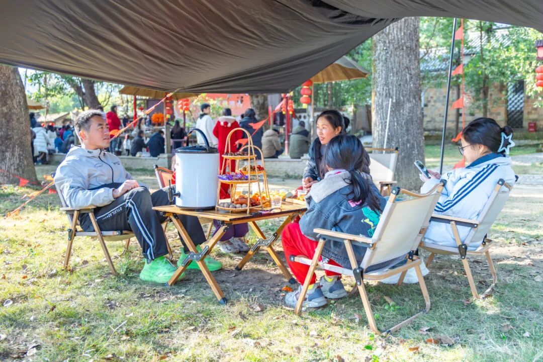 阳光温暖和煦,景区河畔的“天幕露营、围炉煮茶”区域人气渐旺。一个个白色的天幕整齐排列,天幕下摆放着桌椅,三五好友围坐在一起,一边品着香茗,一边品尝着烤得香甜的小吃,畅谈生活趣事,享受着难得的悠闲时光。“平时工作太忙了,趁着元旦假期,约上朋友来这里露营煮茶,既能亲近自然,又能放松身心,感觉特别惬意。”游客陈先生告诉记者,梅口埠的生态环境很好,这样的活动形式也很新颖,让他感受到了不一样的新年氛围。