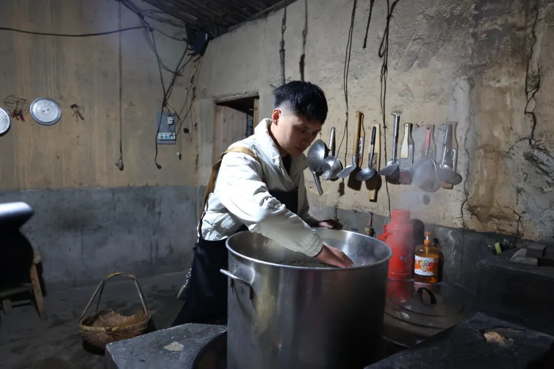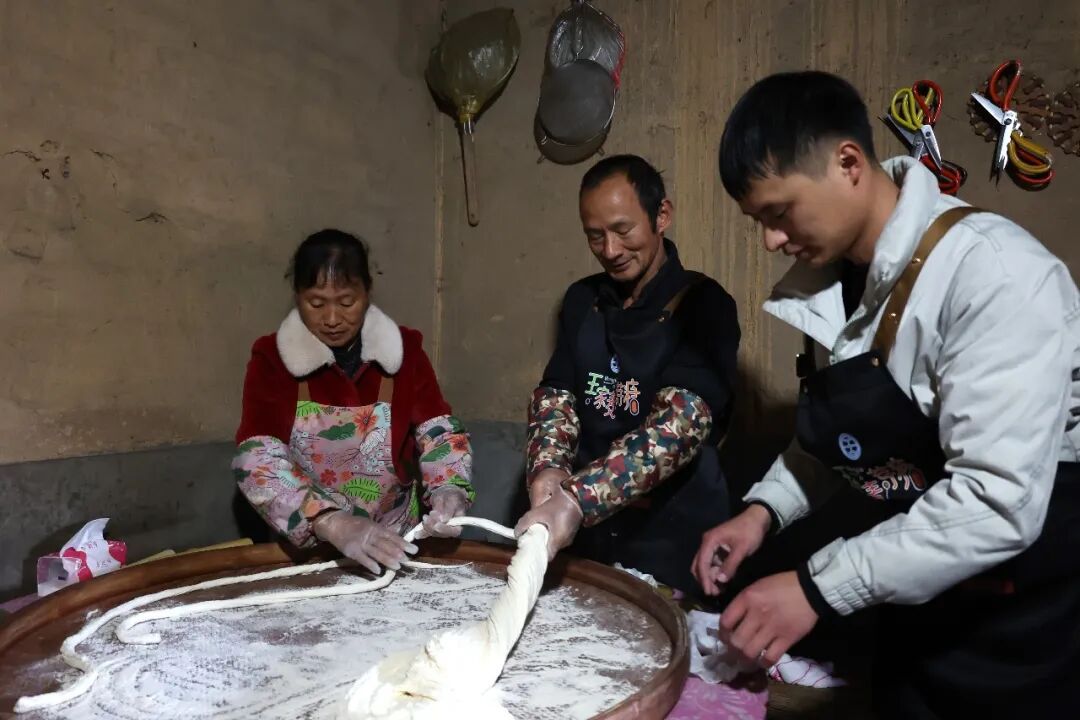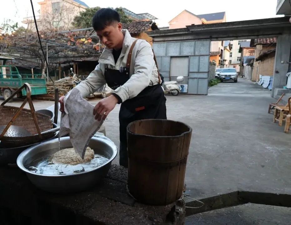 八年前,王磊从爷爷手中接过这门手艺。从此,他始终坚守手工初心,将祖辈的智慧融入每一道工序。制作麦芽糖,第一道工序是培育麦芽。冬日寒冷,麦粒不易发芽,王磊便沿用家族古法——将装着小麦的竹篮沉入家中古井。“井里温暖湿润,是麦子天然的‘暖房’,出芽更快。这是我们祖辈传下的经验。”他笑着说道。此后每一天,他都会细心取出竹篮清洗麦子,在日复一日的照料下,7天后麦粒长成所需的嫩黄新绿的麦苗。