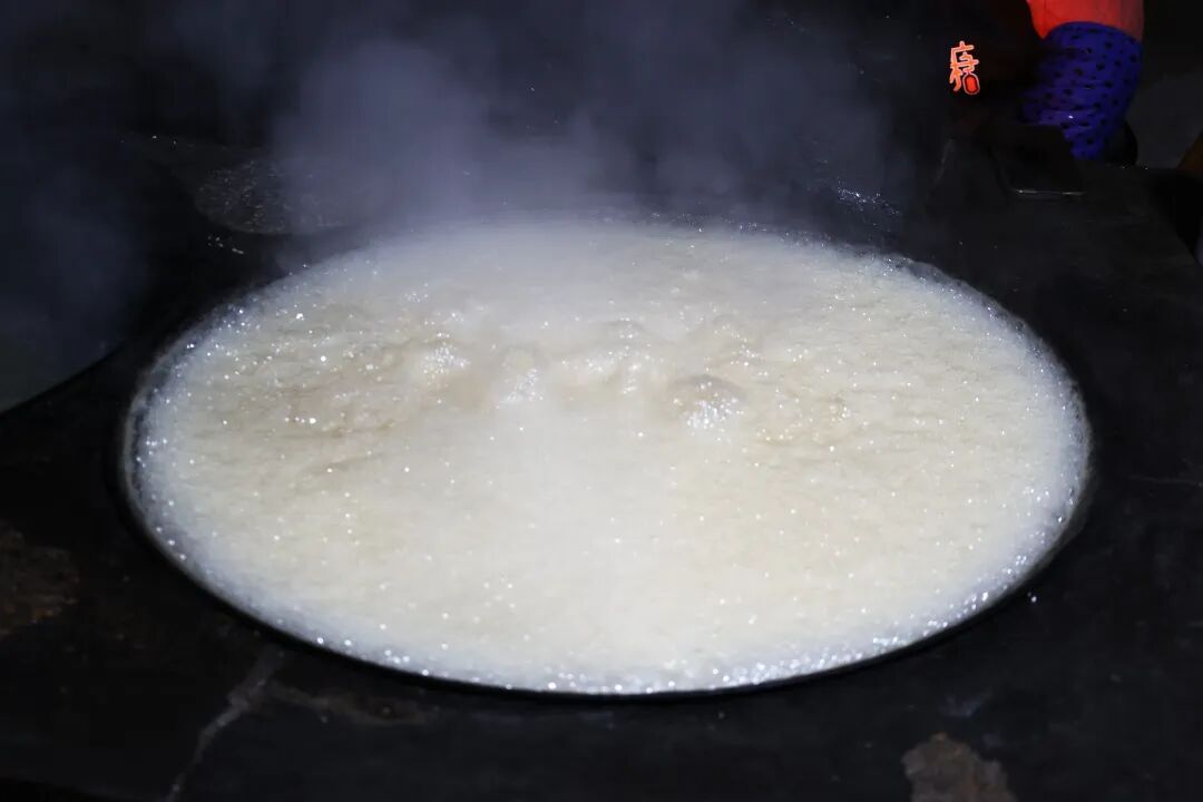麦芽长成后,便进入与糯米发酵转化的关键阶段。按照祖传配比,王磊将切碎的麦芽与蒸熟的糯米饭仔细拌匀,静静等待8小时后,淀粉在酶的作用下转化为糖。次日天未亮,他便起身将混合的原料装篮过滤,挤压出透亮清香的汁液。随后,他将汁液倒入锅中,守在灶台前不停的搅拌。“熬制麦芽糖,火是灵魂,一定要文火慢熬。”他紧盯着锅中糖液的变化,生怕一丝急躁让糖熬焦产生焦苦味。随着2小时的时间推移,糖液从浅白渐渐熬成透亮的焦糖色,提起时可拉出缕缕晶莹的糖丝——这时,糖油才算熬成。