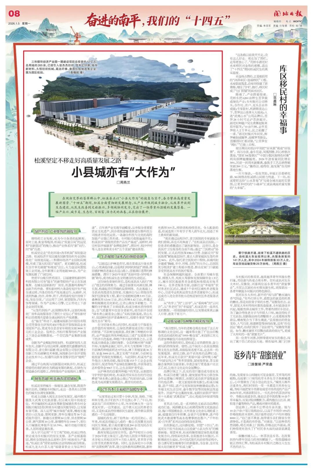 三和循环经济产业园一期建设项目总投资约12亿元,总用地约265亩,已招引入驻杰杰纺织、佳利仑纤维、致存新材料、久恒纺织机械、高远纤维、奥固拉链制造等企业。 在闽浙交界的苍翠群山中,松溪县正以“小县大作为”的抱负与实干,奋力擘画高质量发展新图景。“十四五”期间,松溪全面贯彻新发展理念,从产业升级到城乡融合,从改革开放到生态建设,从民生改善到文旅振兴,多领域协同发力,交出了一份厚重而温暖的发展答卷。一幅产业兴、城乡美、生态优、百姓富、活力足的画卷,正在徐徐展开。 绿色智造,产业能级跨越提升 曾经的工业短板,化为今日奋进的起跳板。面对土地、配套等瓶颈,松溪以“筑巢引凤”的远见和“创新驱动”的魄力,推动产业体系向“新”而行、向“绿”而进。 松溪坚定走“优化环境+改革机制”双轮驱动之路。松溪经济开发区城东园新型纺织专业园标准化厂房拔地而起,三和循环经济产业园初具规模,形成了强大的项目“磁场”。更关键的是,松溪在全市率先破题“标准地”出让,大力盘活闲置低效工业用地,全年新增工业用地超500亩,为产业发展拓展了广阔空间。 优质平台吸引优质项目。以福建常松新材料科技有限公司为“链主”的新型轻纺产业正在加速集聚。在城东园崭新的厂房里,机器轰鸣奏响产业跃升的序曲。常松新材料六条涤纶短纤生产线全速运转,四条后纺生产线高速运行,从破碎、风送到热融、纺丝、牵伸、烘干,优质涤纶短纤持续下线,发往全国,广泛应用于卫材、家居服饰、汽车内饰等领域。作为产业核心引擎,它正带动上下游企业协同发展。 “从签约到投产,比预期快得多,这里的标准化厂房和高效服务给了我们十足信心!”常松新材料总经理周杰望着全速运转的生产线感慨。 在“链主”带动下,福建闽瑞新合纤股份有限公司凭借自主研发的ES纤维获评省级制造业单项冠军产品,更成为全县首家年税收突破3000万元的工业企业。佳利仑、韦松纤维等纺织产业链上下游企业相继落地,一个百亿级产业集群加速成形。 创新为产业崛起持续加持。松溪研发投入逐年加大,创新平台结出硕果,福建省民盛健康科技有限公司、普仑斯(福建)泵业有限公司依托博士创新工作站破解技术难题,闽瑞新合纤获评省级企业技术中心,恒通四众跻身省数字经济“瞪羚”企业。 通过平台构筑与创新驱动双轨并行,松溪正将曾经的制约转化为跨越发展的跳板,在绿色与智造融合的道路上,持续推动产业能级向上攀升。 城乡共融,和美画卷徐徐铺展 松溪县坚持城乡一体规划、融合发展,既提升城市品质,又赋能乡村振兴,走出一条具有山区特色的城乡协调发展新路。 松溪主动融入闽东北协同发展区、福州都市圈及大武夷文化旅游圈,在区域大局中找准定位。科学编制《松溪县统筹新型城镇化和乡村全面振兴规划》及《和美乡村建设风貌导则》,让发展有章可循。深入运用“城市体检”成果,精准实施老旧小区改造、管网更新、停车位增设等30个品质提升项目。新建污水管网50公里、供水管网50公里、燃气管网10公里,新增停车位1000个,常住人口城镇化率提升至53.79%。城市功能日臻完善,人居环境显著改善。 深入学习运用“千万工程”经验,松溪让特色农业成为乡村振兴的坚实支撑。茶产业根基稳固,拥有全国绿色食品原料(茶叶)标准化生产基地,“松溪红茶”国家地理标志证明商标成功续展,松溪九龙大白茶入选“福建省农业主导品种目录”。百年蔗产业实现华丽蝶变,从申报全球重要农业文化遗产,到合资组建福建蔗道生物科技公司推进市场化运营,一条融合科技与文化的高附加值产业链已然形成。乡村振兴成效遍地开花:松溪获评“省级优质农产品生产基地”,溪畔村、岭完村获评福建省“金牌旅游村”,渭田村、招沙甲村等入选全省和美乡村“五个美丽”建设典型。 生态赋能,绿水青山颜值更靓 “以前巡山护林是责任,现在看着这片绿水青山,心里满是自豪,这是我们共同的财富!”清晨,渭田镇护林员老潘走在巡山路上,望着满目苍翠的林海感慨。渭田于2023年荣获“美丽中国·深呼吸乡镇”称号,成为松溪生态文明建设的生动见证。 这份绿色荣誉的背后,是松溪县深入践行“两山”理念的持续努力。通过全面落实河湖长制、林长制,构建起责任明确的监管网络。在此基础上,全县系统推进生态修复,实施环白马山省级自然保护区修复等工程,累计完成植树造林3.93万亩、森林抚育12.64万亩、封山育林5.42万亩,并通过林相规模化花化彩化,让青山焕发多彩魅力。不懈的守护换来了丰硕成果:松溪全域水质持续优良,空气质量常年位居全省前列,成功获评全国“绿水青山就是金山银山”实践创新基地,吴山头村、钱园桥村获评省森林村庄,祖墩乡荣获“国家级生态乡”称号。 在守好绿水青山的同时,松溪致力于探索生态价值的有效转化,让绿色资源变成百姓口袋里的财富。“不砍树也能致富,我们林下种植的中草药,亩产效益比传统种植高出三成!”在祖墩乡林下经济示范基地,种植户李大姐的欣喜之言,正是松溪点绿成金之路的缩影。全县积极对接“双碳”目标,实施林业碳汇项目,并大力发展林下经济,目前林药种植面积达9772亩,林下养殖家禽30万羽、家畜3000余头,真正实现“不砍树、少砍树也能致富”的绿色发展模式。与此同时,松溪为产