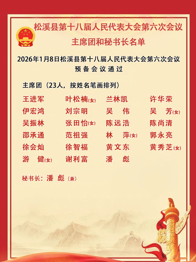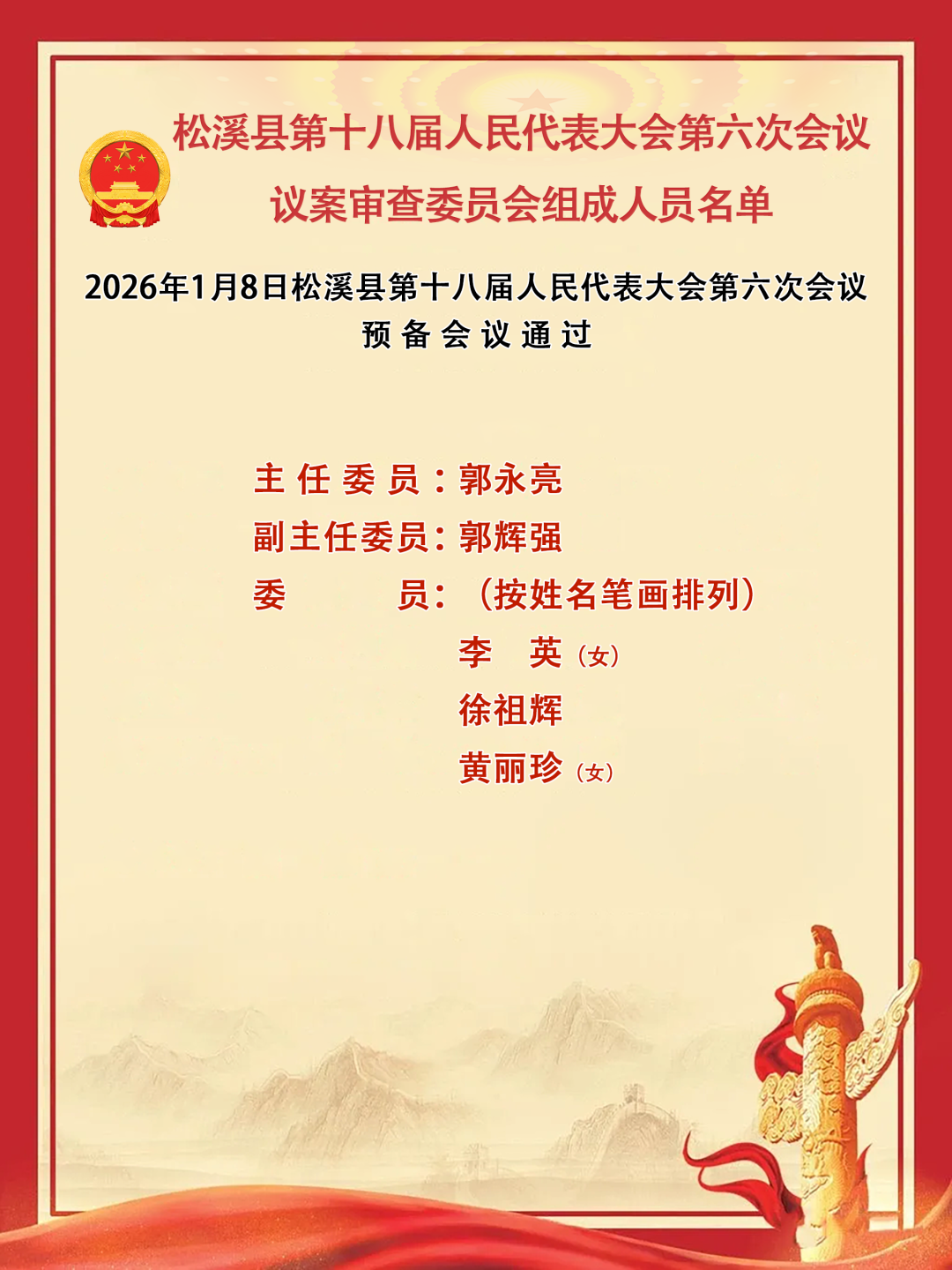 1月8日下午,松溪县第十八届人民代表大会第六次会议预备会召开,会议应到代表177名,因事因病请假14人,实到163人,符合法定人数。
