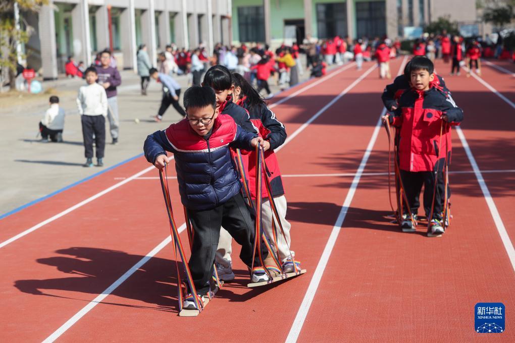 1月9日,诸暨市陶朱街道城西小学的学生在操场上参加走板鞋游戏。 近期,为丰富学生课间生活、传承中华优秀传统文化,浙江省诸暨市陶朱街道中心学校下属各小学开设了传统游戏课程,打陀螺、跳房子、踩高跷等多项传统游戏让学生们玩得不亦乐乎。 新华社记者 徐昱 摄