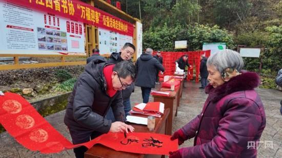 井冈山市书法家协会的同志正在为村民写春联(央广网记者 郇康新 摄) 神山村群山环绕,毛竹资源丰富。10年前,这些层层叠叠的竹林是挡住村民们出山的“屏障”,而如今,神山村瞅准毛竹产业的潜力,引进现代竹编加工技术,还搭建电商销售渠道,让不起眼的毛竹,变成了家家户户的“致富竹”。