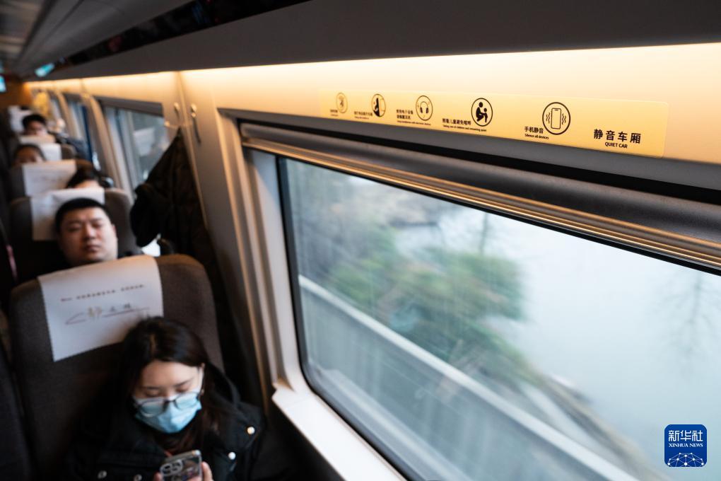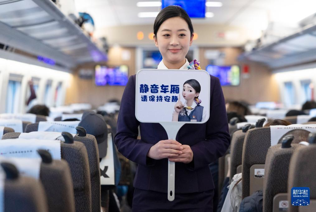 2月1日,中国铁路上海局集团有限公司合肥客运段在G54次列车上进行“静音车厢”宣介活动。 自2月1日起,高铁“静音车厢”服务将拓展至除动卧列车之外的“D”字头、“G”字头部分列车,全国铁路提供“静音车厢”服务的列车将超8000列。 新华社记者 杜宇 摄