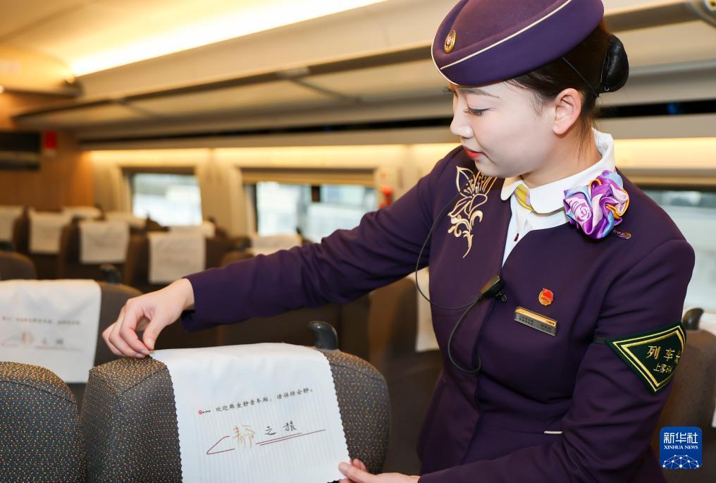 2月1日,铁路上海客运段列车长在G12次列车上整理静音车厢标语。 自2月1日起,高铁“静音车厢”服务将拓展至除动卧列车之外的“D”字头、“G”字头部分列车,全国铁路提供“静音车厢”服务的列车将超8000列。 新华社记者 王翔 摄