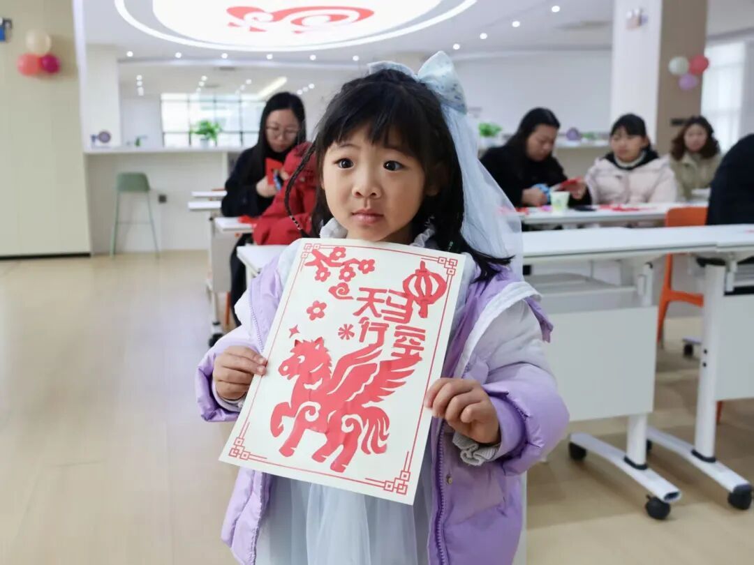 春幡环节中,参与者们纷纷拿起鲜红的卡纸与锋利的剪刀,开启创作之旅。孩子们在家长们的陪伴下小心翼翼地裁剪着每一刀,指尖在红纸上灵动穿梭,亲子间的默契与温情在互动中流转、升温。不多时,一幅幅寓意美好的春幡相继出炉,“马到功成”“天马行空”等饱含马年新春期盼的字样与图案跃然纸上,每一件作品都承载着家庭的美好祝福。