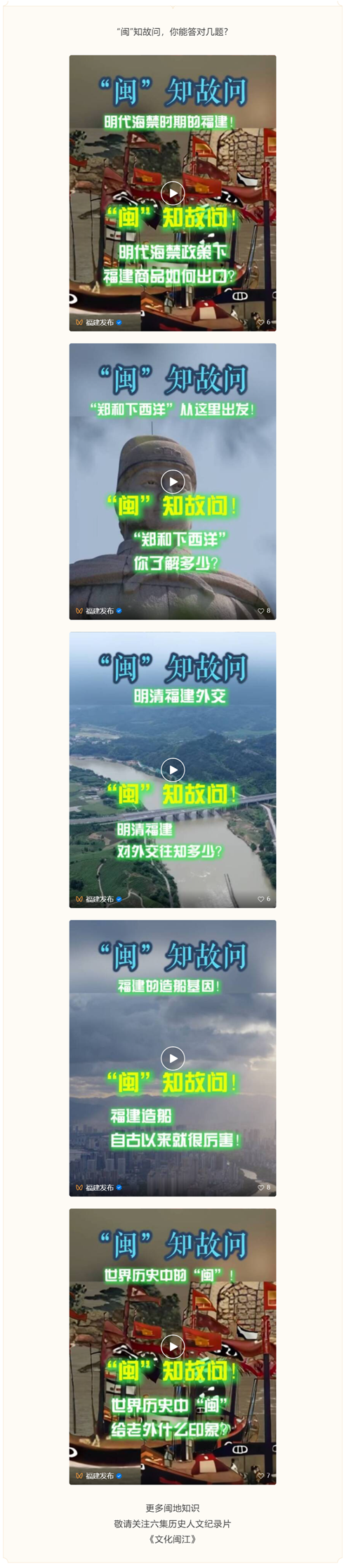 更多闽地知识 敬请关注六集历史人文纪录片 《文化闽江》 作为“福建文脉”工程第一季作品,纪录片由福建省委宣传部策划指导、省广播电视局支持、省广播影视集团历时近两年精心打磨,以母亲河闽江为叙事主轴,贯通自然地理、历史变迁与当代风采,全景呈现闽江流域的文化根脉、人文价值与时代气象。