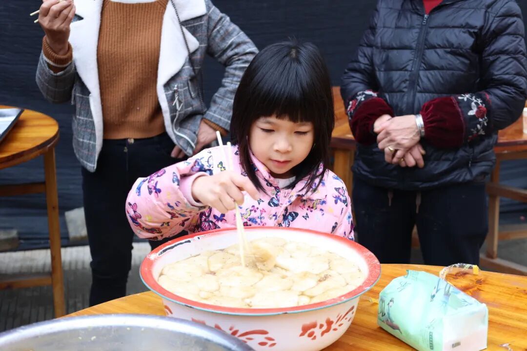 活动现场,石臼、糍粑棍等工具一应俱全,村民们默契协作,蒸糯米、打糍粑、捏糍粑、裹糖粉,各环节井然有序。大家在石臼旁齐心协力捶打,软糯香甜的糍粑新鲜出炉,现场欢声笑语不断,尽显传统民俗魅力与邻里温情。