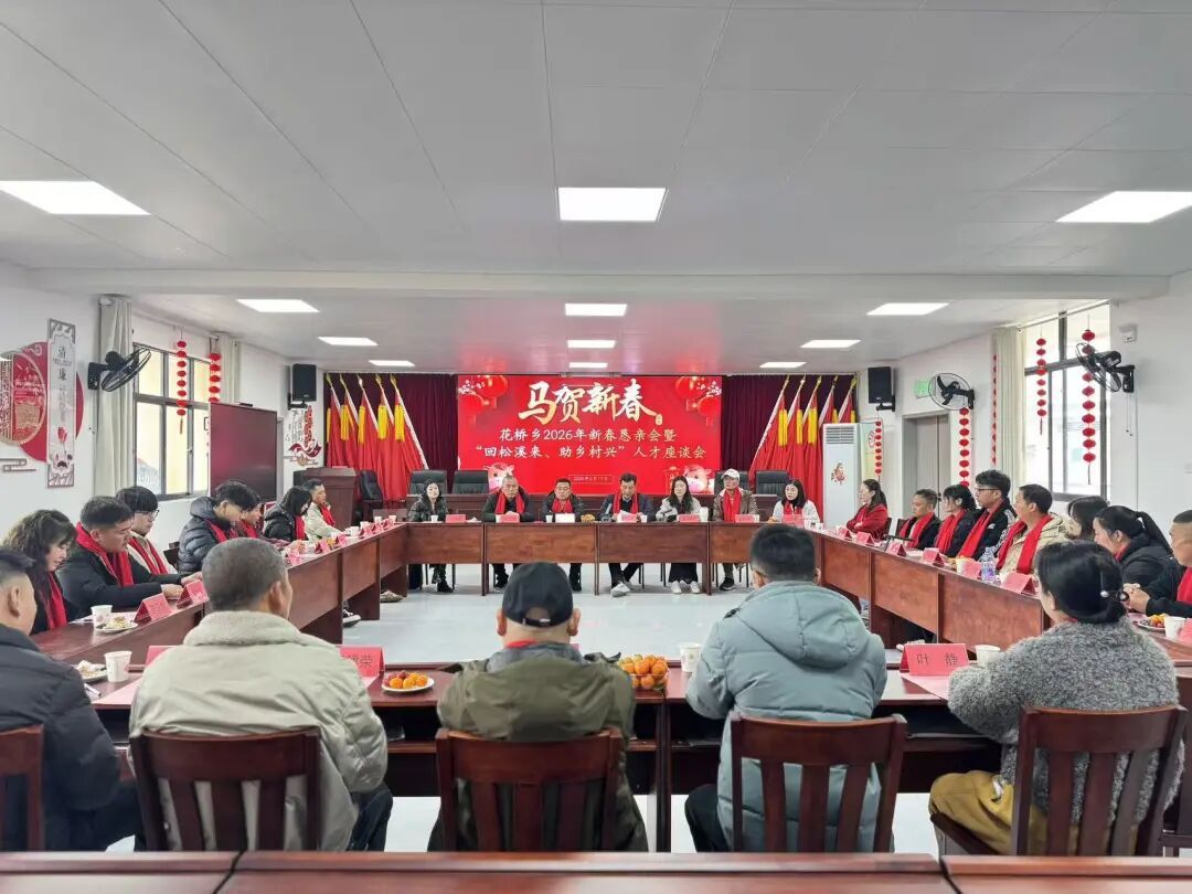 2月19日,花桥乡举办2026年新春返乡人才座谈会。30余位后备力量、返乡创业青年、致富能人代表与乡党政班子成员齐聚一堂,共叙桑梓情谊、共话家乡发展。 座谈会上,与会人员通过观看宣传片,直观感受花桥乡发展的新面貌、新机遇与新蓝图。乡党委书记伊宏鸿代表乡党委、政府向大家致以新春祝福,感谢其长期以来对家乡的关心与反哺,并重点介绍了2025年乡村振兴工作进展。 交流环节中,在外优秀人士代表踊跃发言,纷纷点赞家乡变化。路桥村驻村第一书记叶帝业分享了自己用抖音、视频号记录和宣传畲乡风情、红色底蕴和农产品的经历;返乡大学生孙晨涛以母亲为榜样,表达了作为年轻新农人带领乡亲增收致富的强烈愿望;返乡创业者胡明表示,将以教育为桥、以初心为舵,当好花桥发展的“宣传员”与“建设者”,以实际行动反哺家乡,助力桑梓振兴。