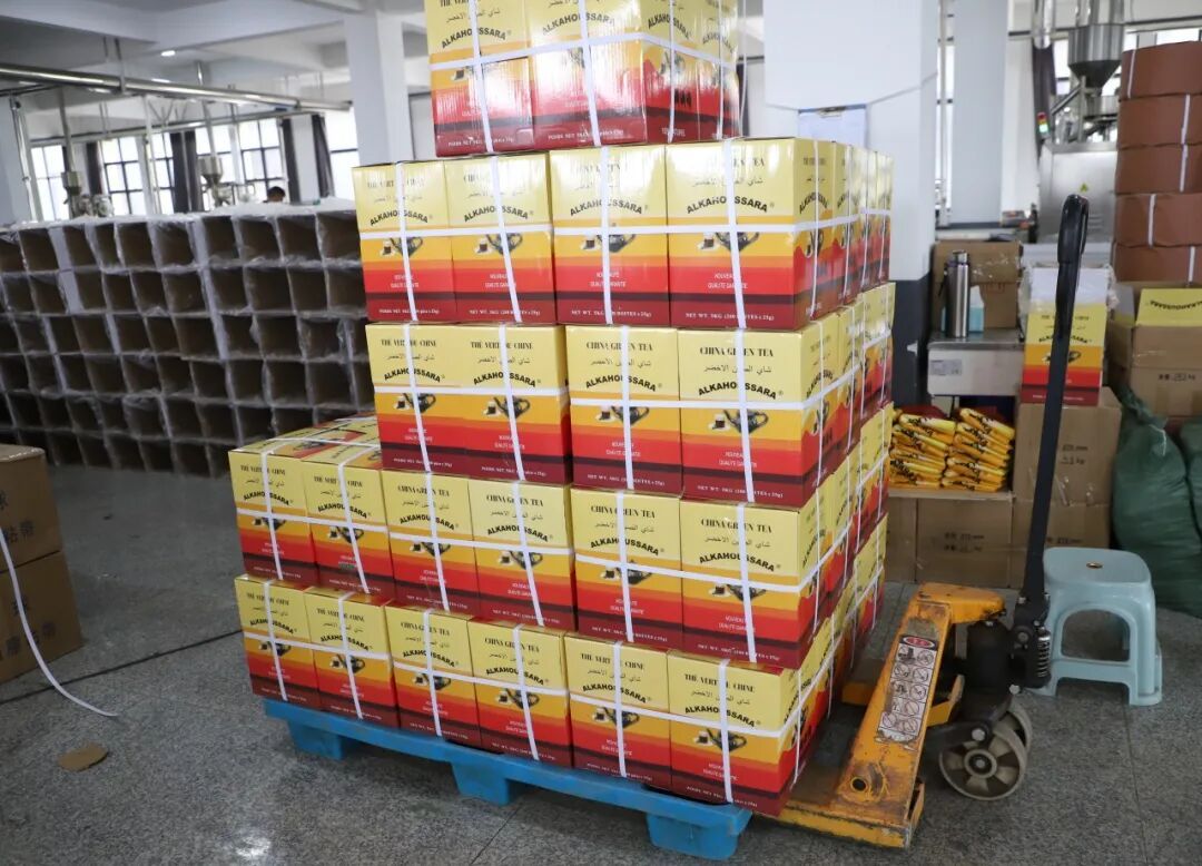 走进车间,自动化生产线满负荷运转,机械臂在工人配合下精准作业。从茶叶精制、称重封口,到成品打包、码垛入库,各道工序衔接紧密、高效推进。一批批包装齐整的成品茶整齐列队,即将装车启程,远销海外市场。