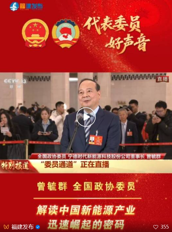 今天下午 全国政协委员 宁德时代新能源科技股份公司董事长 曾毓群 亮相全国政协十四届四次会议 首场“委员通道” 曾毓群介绍,这几年,宁德时代建立了非常强劲的有韧性的供应链和生态体系。展望未来,宁德时代会加大研发投入,尤其是应用更多人工智能的方式。宁德时代会把中国的产品卖到全世界,同时也会把技术、标准推广到全世界,跟全世界所有的同行一道继续努力,真正为新能源事业作出卓越贡献。 持续创新的宁德时代 作为我国新能源电池产业高地,福建的锂电池产量、出口量连续多年居全国第一。作为行业龙头,宁德时代动力电池装机、储能电池出货量连续多年保持全球第一。 宁德时代累计研发投入超800亿元,汇聚全球研发人员2万多名,布局专利5万多件,搭建21C创新实验室、电化学储能技术国家工程中心等高水平研发平台,与国内外高校和科研院所开展联合技术攻关。
