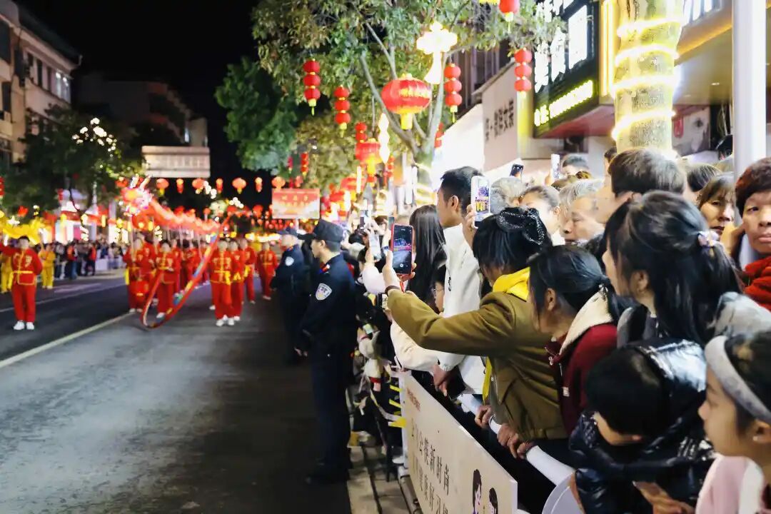 龙腾狮跃庆盛世,锣鼓喧天闹元宵。3月3日晚,松溪县举行“福马当先 龙腾湛卢”元宵舞龙活动。各乡镇(街道)表演队伍轮番登场,为全县人民献上一场极具地方特色的民俗盛宴,吸引数千名群众驻足观赏。 活动开始前,县委书记吴伟、县长张田怡、县人大常委会主任谢利富、县政协主席陈建斌来到现场,向全县人民致以节日的问候和美好的祝福,祝愿大家元宵节快乐、阖家幸福、马年大吉。 随着铿锵有力的锣鼓声响起,来自各乡镇(街道)的舞龙队伍沿县城主街道展开巡游。在舞龙队员的默契配合下,金龙腾空而起,时而“龙游四海”蜿蜒盘旋,时而“龙腾九霄”昂首冲天,龙身在夜色中翻飞起舞,龙鳞在灯光下熠熠生辉。舞狮队伍不甘示弱,四头醒狮踏着鼓点腾挪跳跃,狮头灵动俏皮,狮尾稳健有力,引得观众阵阵喝彩。鱼灯队伍则如流水般穿梭在街道两侧,十余盏鱼灯首尾相接,在夜色中形成一条流动的光河,仿佛群鱼嬉戏于湛卢山间清澈的溪流。腰鼓方阵更是气势如虹,队员们身着鲜艳服饰,腰系红绸,双手击鼓,步伐整齐划一,鼓点明快有力,与龙狮表演交相辉映,将现场气氛推向高潮。