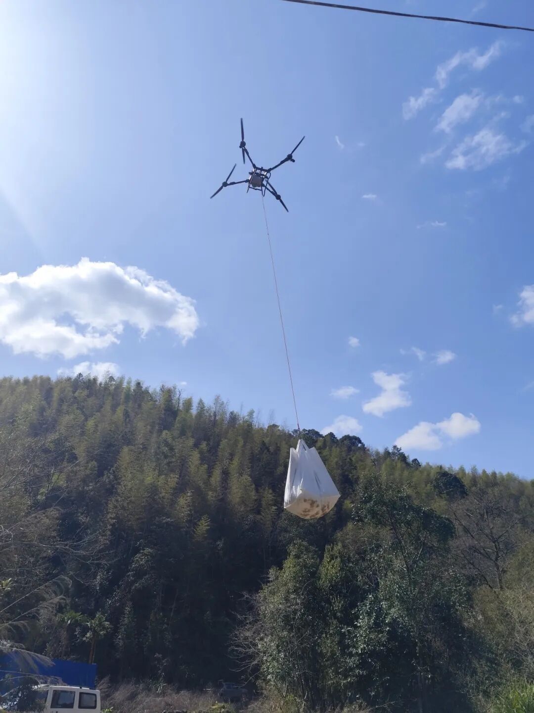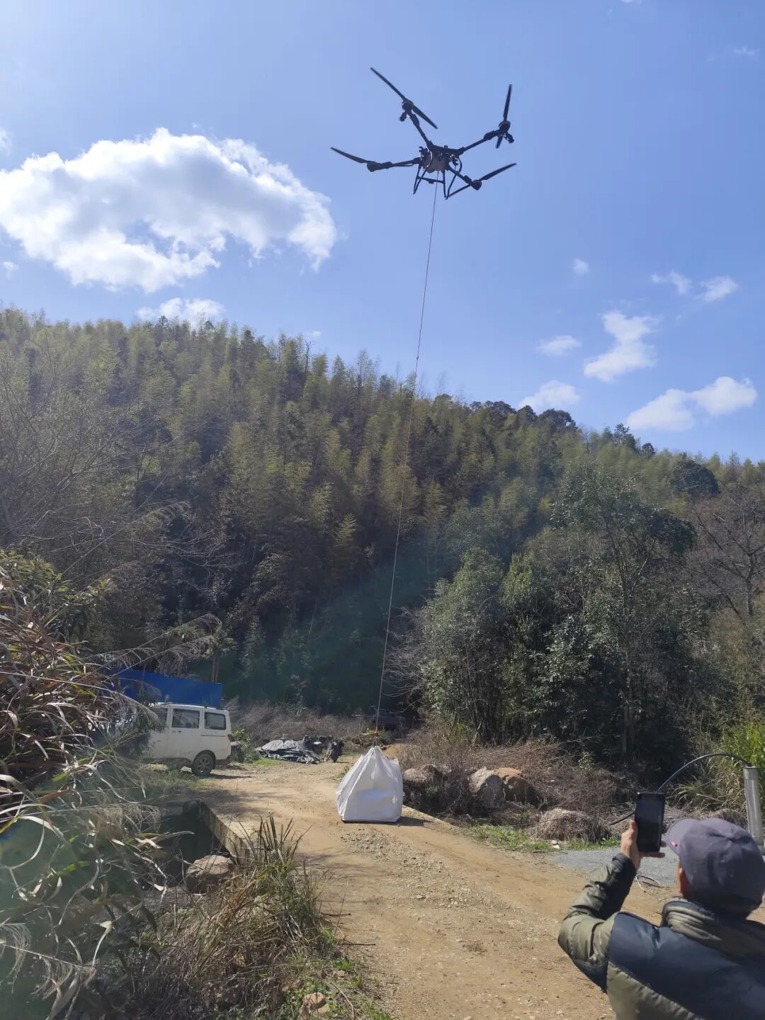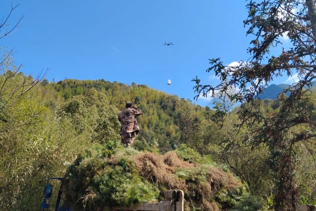 受地形复杂和近期雨水较多影响,林场部分区域车辆无法通达,传统人背肩扛方式效率低、风险高。林场引入无人机实施定点吊运与精准投放,配备专人操作与地面协同,涵盖装载、起降、卸苗等环节,确保作业安全有序。