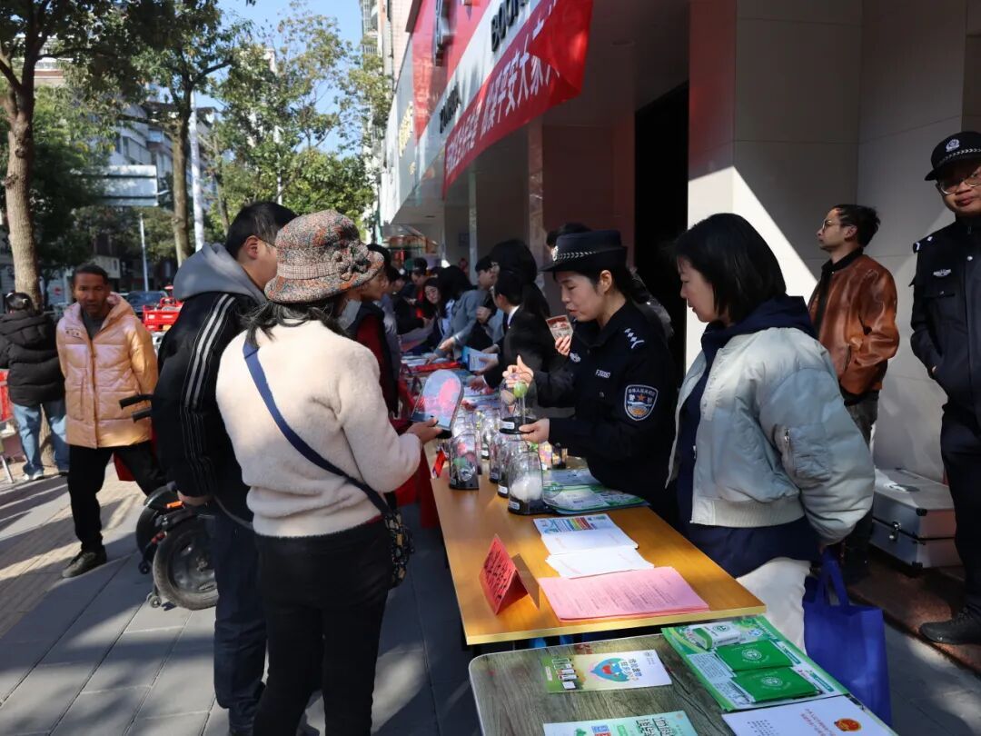 活动现场,各类平安建设宣传展板整齐排列,工作人员向过往群众发放平安三率、消防安全、交通安全、未成年人保护、扫黑除恶、禁毒防毒、反邪教、国家安全等宣传资料,并围绕群众关心的安全问题,开展多维度现场讲解。消防方面,手把手教学灭火器“提、拔、握、压”使用步骤;禁毒方面,通过仿真毒品模型,引导群众认清毒品陷阱、自觉远离毒品;交通方面,重点宣传道路安全法规,同时为现场群众的电动车免费张贴反光条,从细节处筑牢夜间出行安全防线。现场群众积极参与互动咨询,主动领取宣传资料、体验灭火器操作、为电动车贴反光条,形成“人人学安全、人人讲平安”的良好互动氛围。