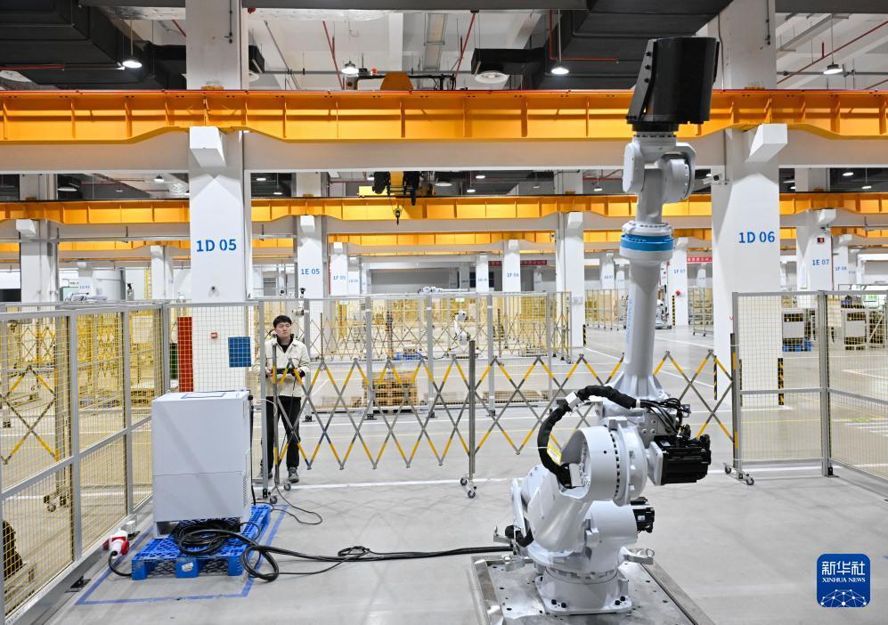 3月17日,在位于南京市江宁开发区的汇川技术南京基地自动化车间内,多关节机器人产线在进行出厂前测试。 新华社记者 李博 摄