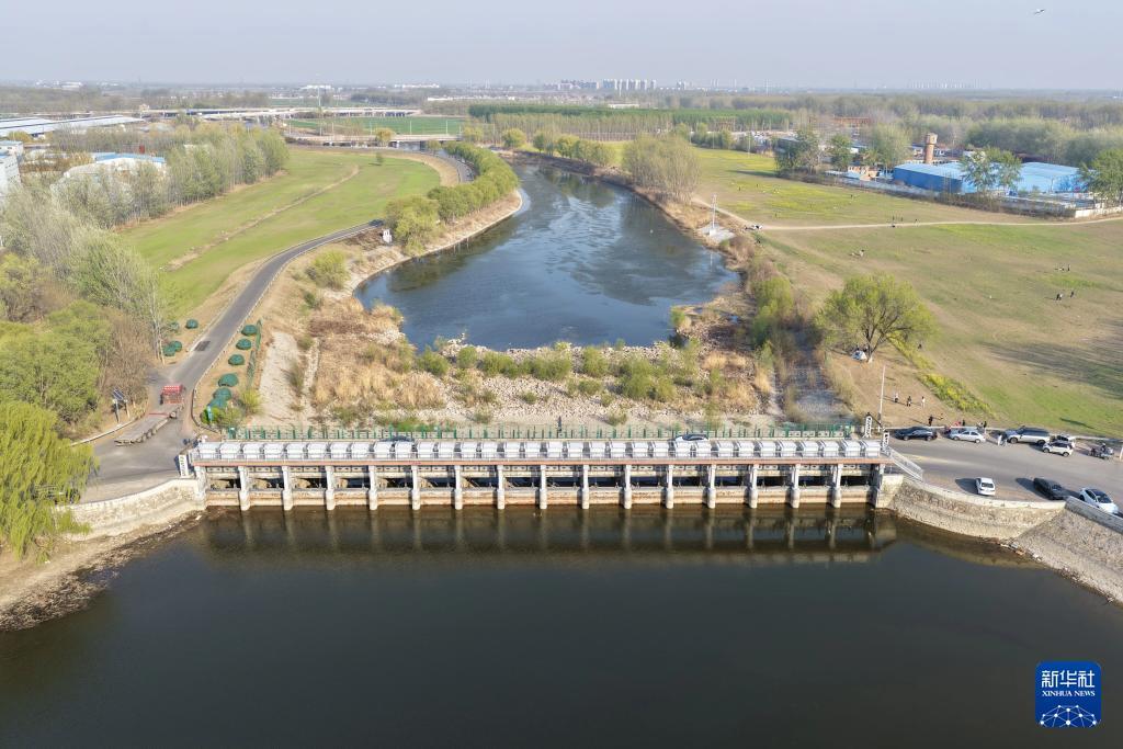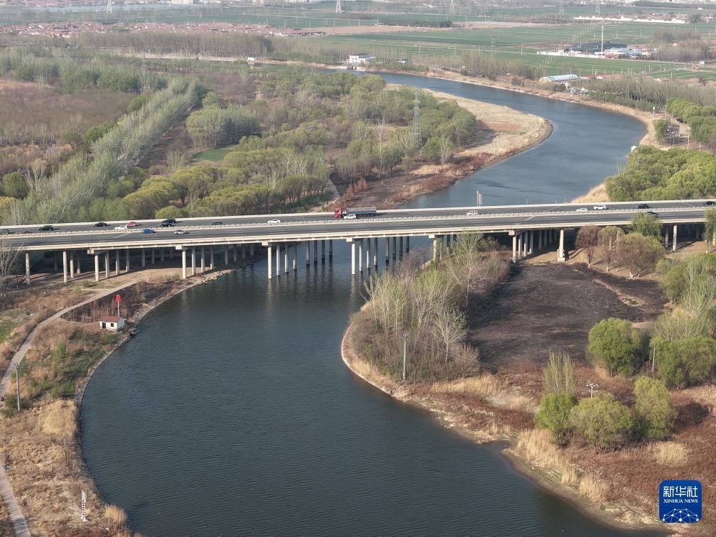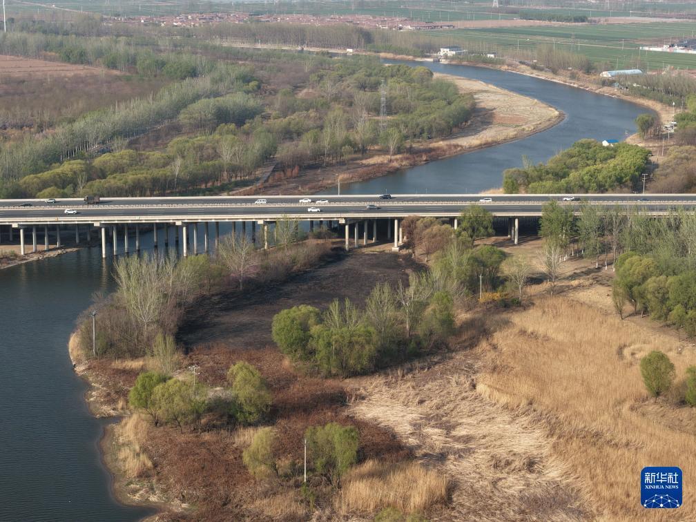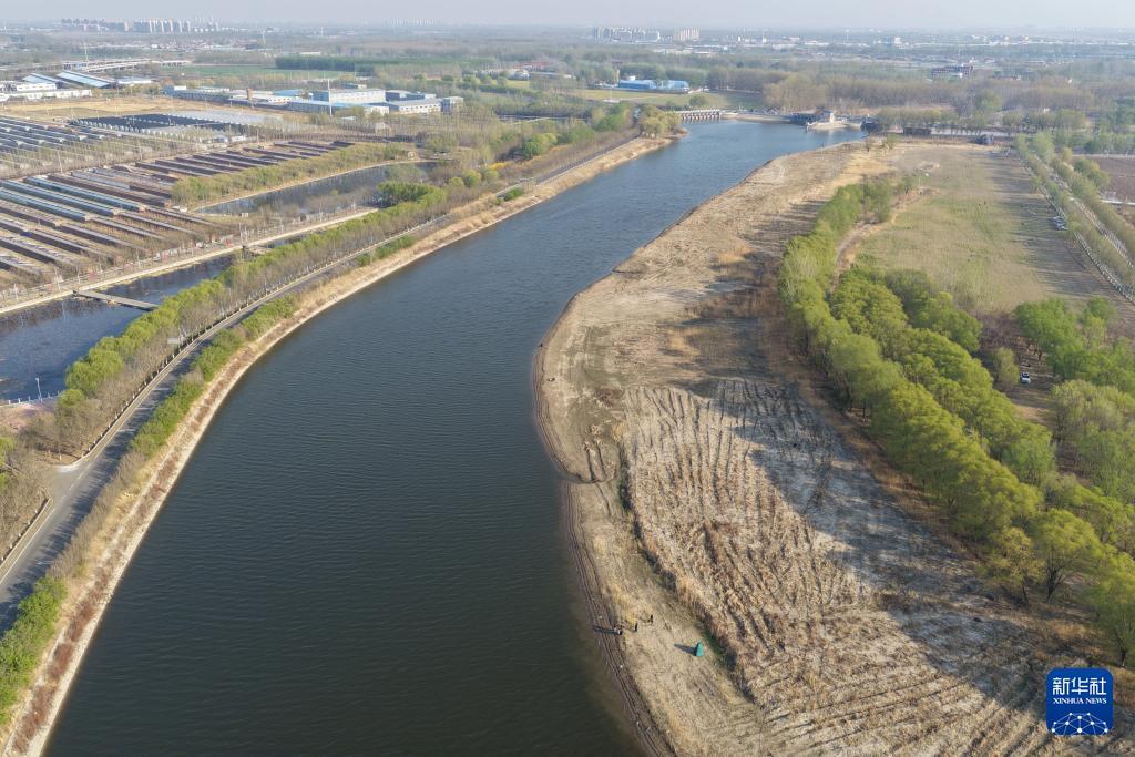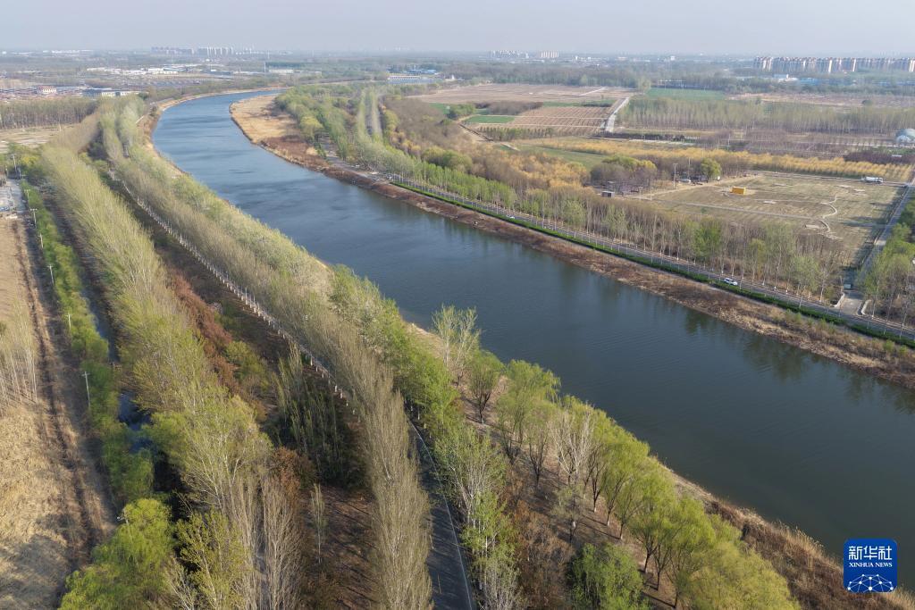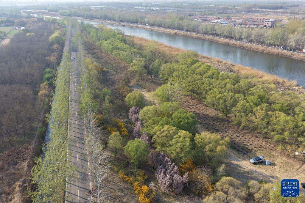 4月4日拍摄的京杭大运河天津武清段的春天景色(无人机照片)。 新华社记者 邢广利 摄
