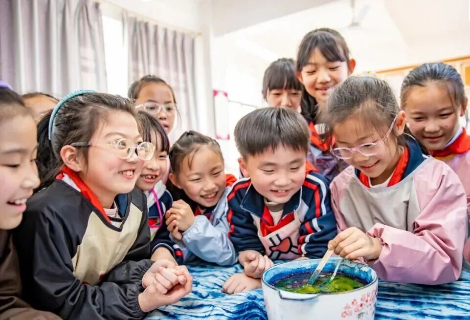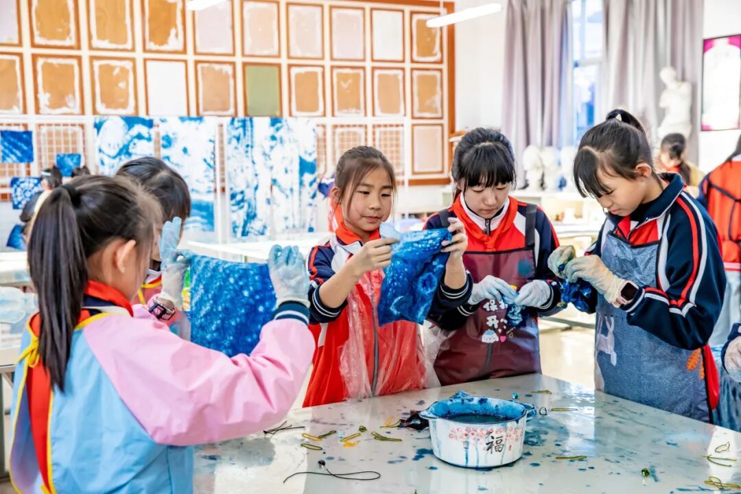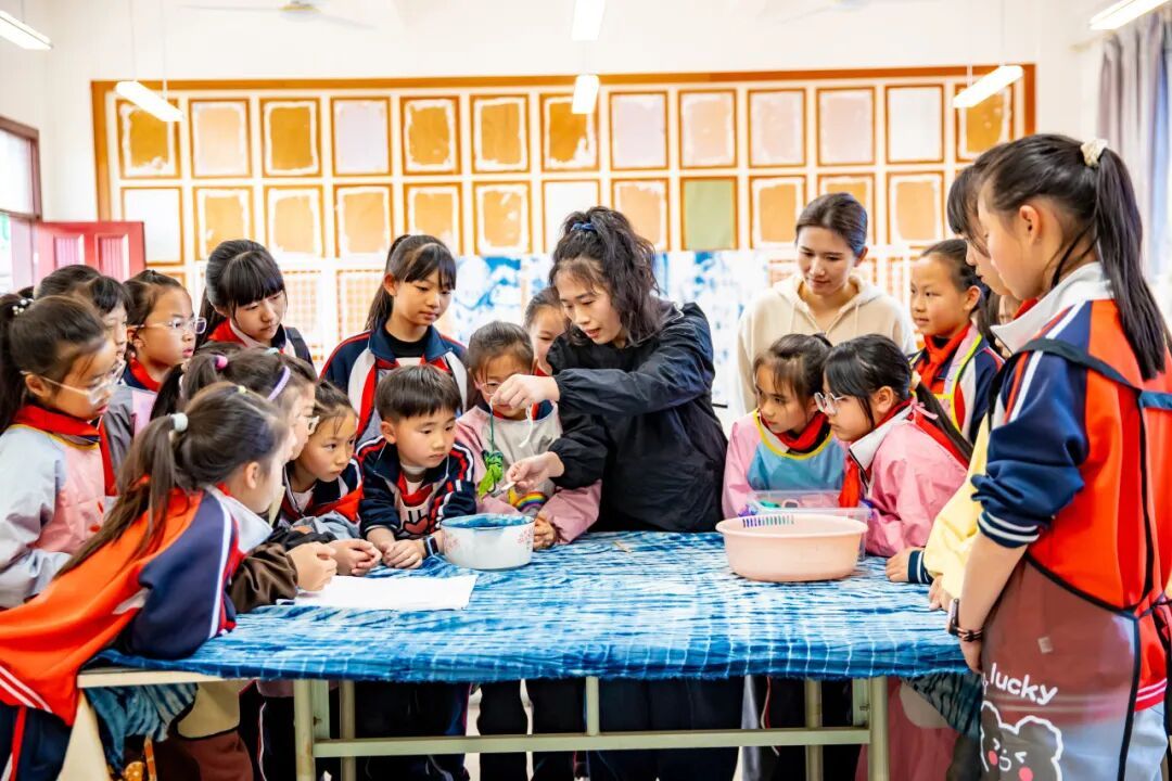 “扎染就像变魔术,每次打开布都特别惊喜!”五年级学生李默萱满脸欢喜地说道。如今她加入扎染社团已有一整个学期,收获满满、进步多多。“以前不知道衣服上的花纹是怎么来的,现在我会自己做啦!”她兴奋地举着刚完成的蓝白方巾,脸上满是成就感。 扎染是中国民间传统的染色工艺,学校将其引入课后社团,既是美育教育的一部分,也是非遗的活态传承。“孩子们在动手过程中培养耐心和创造力,每件作品都是独一无二的,这种‘不确定性’恰恰是扎染的魅力。”扎染社团教学老师毛健萍边说边指导几位学生注意印染时间的控制。
