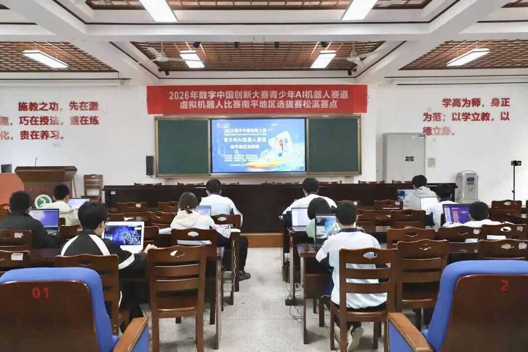 4月11日,2026数字中国创新大赛青少年AI机器人赛道南平地区选拔赛松溪分赛场在松溪二中火热开赛。来自全县多所中学40支参赛队伍齐聚一堂,在虚拟机器人赛的舞台上展开了一场智慧与技巧的巅峰对决,用编程代码勾勒出未来科技的无限可能。