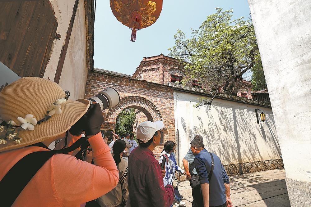 近日,福州三坊七巷历史文化街区,两株百年流苏树迎来花期,洁白如雪,馨香四溢,吸引市民和游客驻足观赏、拍照留念。