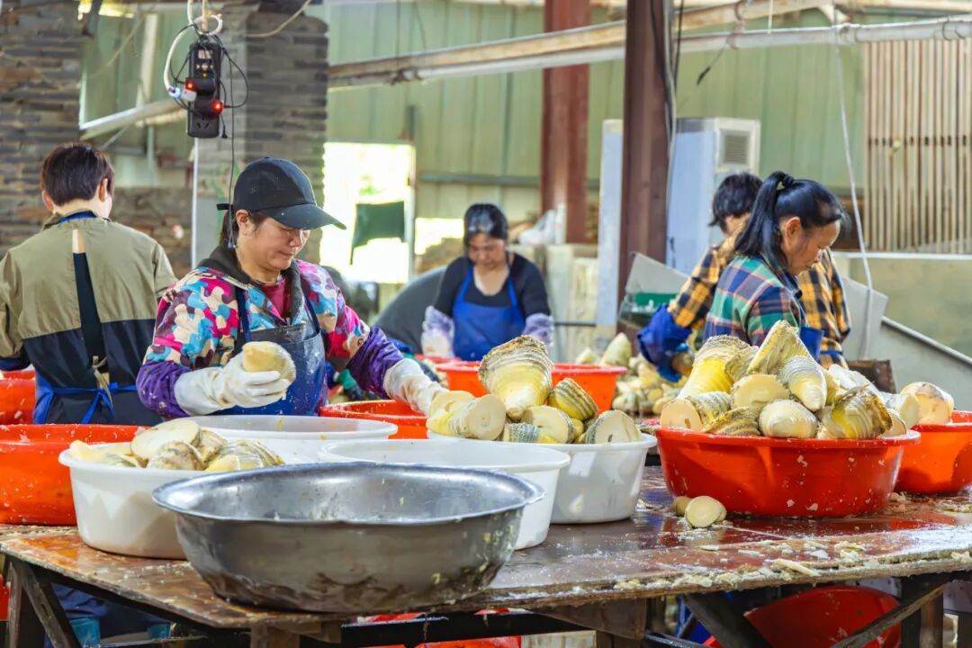 山下,加工厂内机器轰鸣,生产线有序运转。新鲜运到的春笋经过去壳、切根、分级后,被送入自动化清洗池中翻滚冲洗;随后经过高温预煮、冷却等工序,再由工人熟练地装入罐头,最后封口、杀菌、贴标。一罐罐清水笋罐头整齐码放,等待发往国内外市场。春笋从山上到车间,实现了无缝衔接。