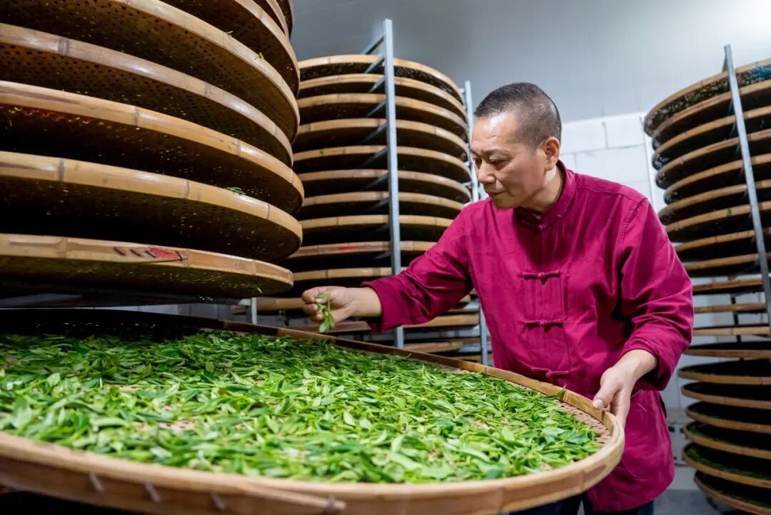 作为土生土长的双源村人,吴荣标与九龙大白茶有着不解之缘。早在上世纪90年代,他便开始专门收茶青贩卖,对这款家乡土生土长的茶叶有着深厚的情感。2009年,他正式开始研究制作白茶,潜心学习茶专业知识,从母树保护到品种繁育,从栽培管理到工艺优化,一步步成长为这一优良品种的守护者和推广者。 采摘下来的鲜叶被迅速运往茶厂车间。在制茶车间里,吴荣标向记者展示了九龙大白茶的传统制作工艺。只见他将新鲜采摘的茶青均匀薄摊在竹筛上,利用自然条件进行萎凋。“萎凋是制作白茶最为关键的一步,要根据光照强度和气温高低酌情控制时长,一般需要两到三天。”吴荣标一边忙碌一边介绍,萎凋之后再经过烘干、保存等系列工序,茶青才能最终变成香醇的白茶成品。
