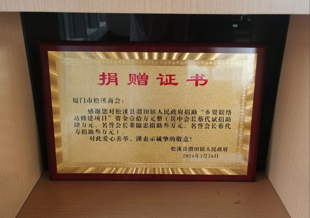 近日,厦门市松溪商会向松溪县渭田镇乡贤联络站捐赠善款10万元,专项用于乡贤联络站修建提升,以拳拳爱心反哺桑梓、凝聚乡情,为家乡基层阵地建设注入乡贤力量。 本次捐赠由厦门市松溪商会三位乡贤会长共同出资,其中现任会长蔡代斌捐资4万元,第三届会长、现任名誉会长董锦忠捐资3万元,第四届会长、现任名誉会长蔡代寿捐资3万元。渭田镇人民政府向厦门市松溪商会颁发捐赠证书,对商会及三位会长的爱心善举表示感谢和敬意。