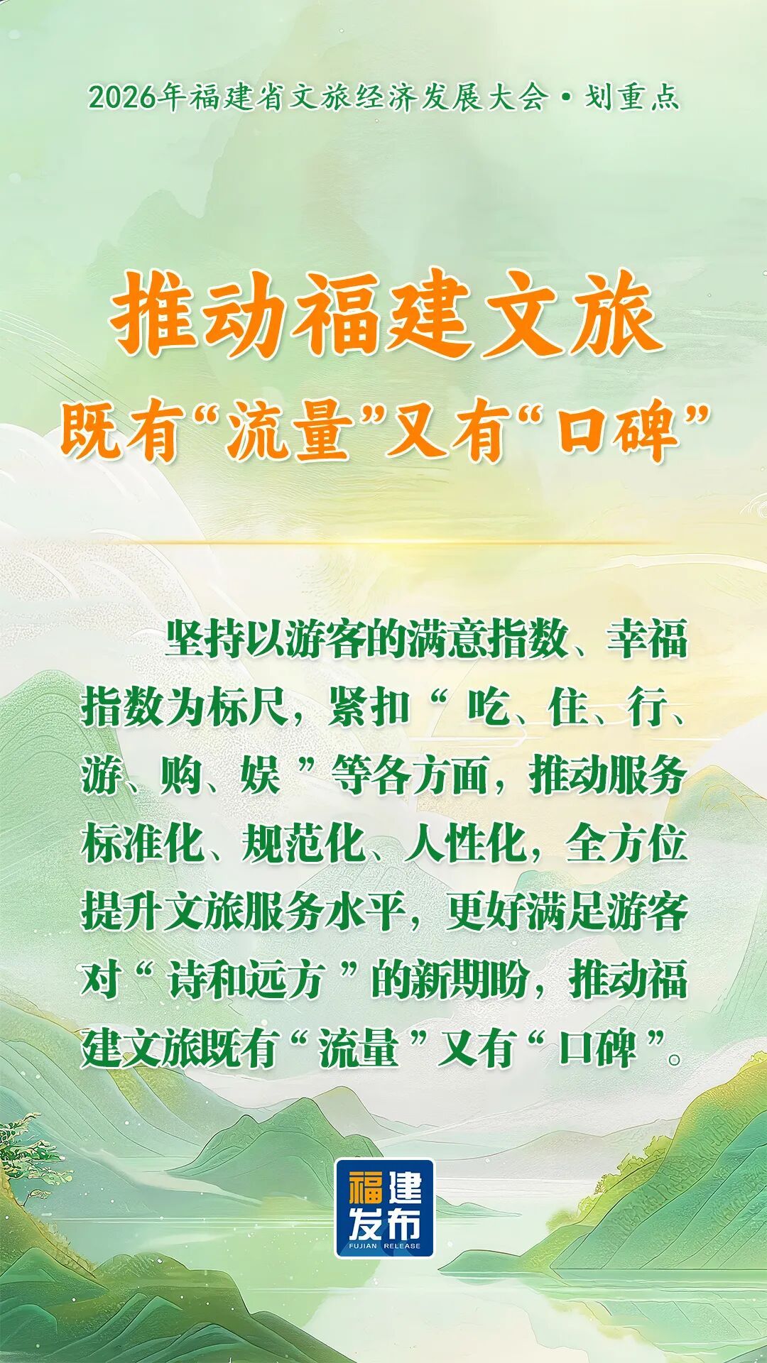 4月18日,2026年福建省文旅经济发展大会在漳州召开。省委书记、省人大常委会主任周祖翼出席并讲话,强调要全面落实习近平总书记关于文化和旅游工作的重要论述和在福建考察时的重要讲话精神,聚焦打造世界知名旅游目的地发展目标、把文化旅游业培育成为支柱产业重要要求、推进文化和旅游深度融合发展实践路径,坚持守正创新、提质增效、融合发展,着力完善现代旅游业体系,在提升文化影响力、展示福建新形象上久久为功,为全省在中国式现代化建设中奋勇争先提供坚实的文旅支撑。省委副书记、省长赵龙主持大会。 让我们通过一组海报 速览大会要点 ↓↓↓